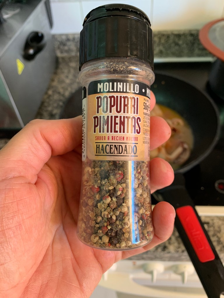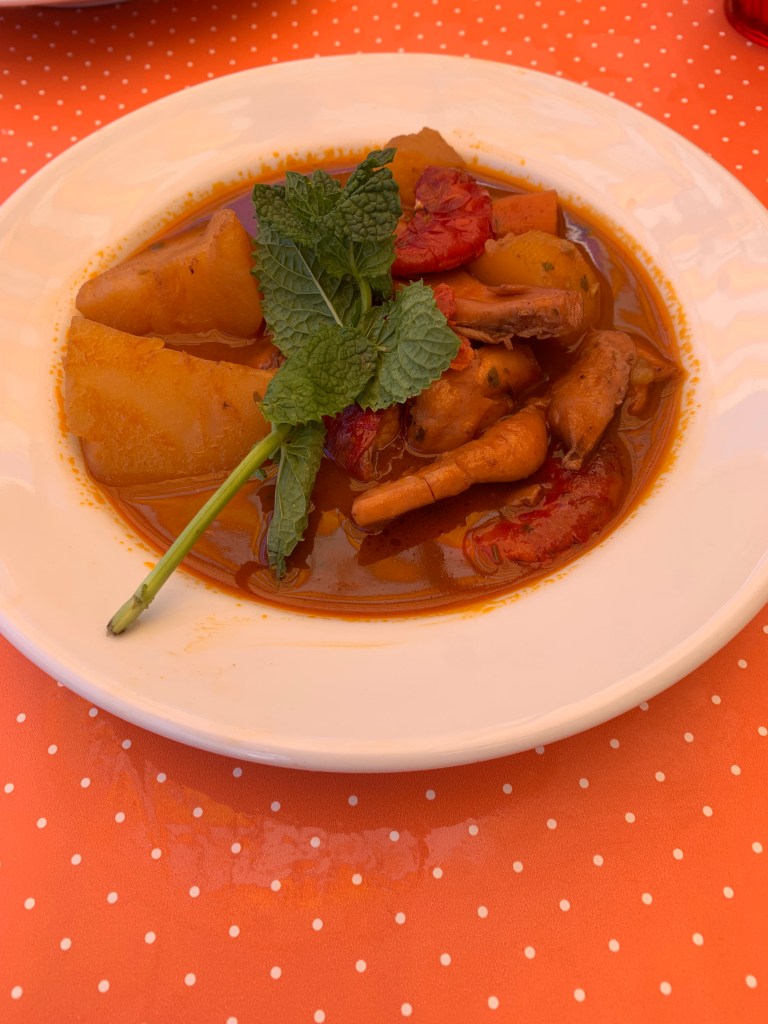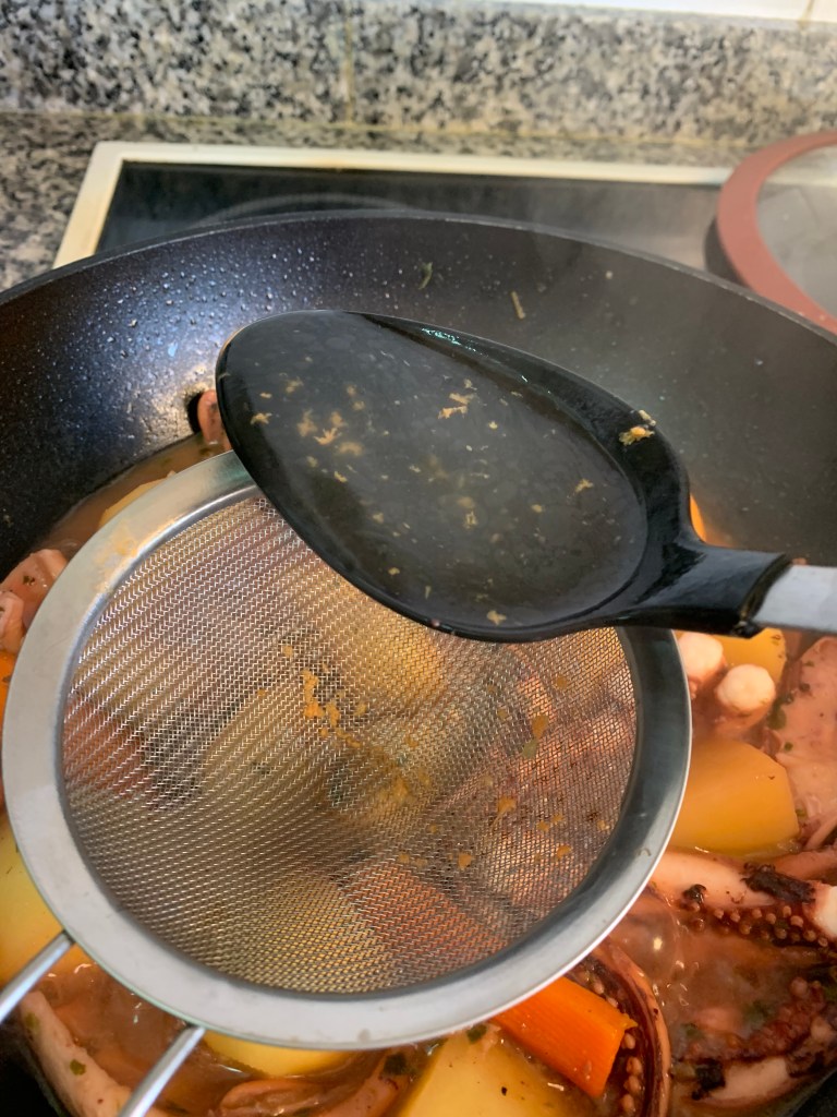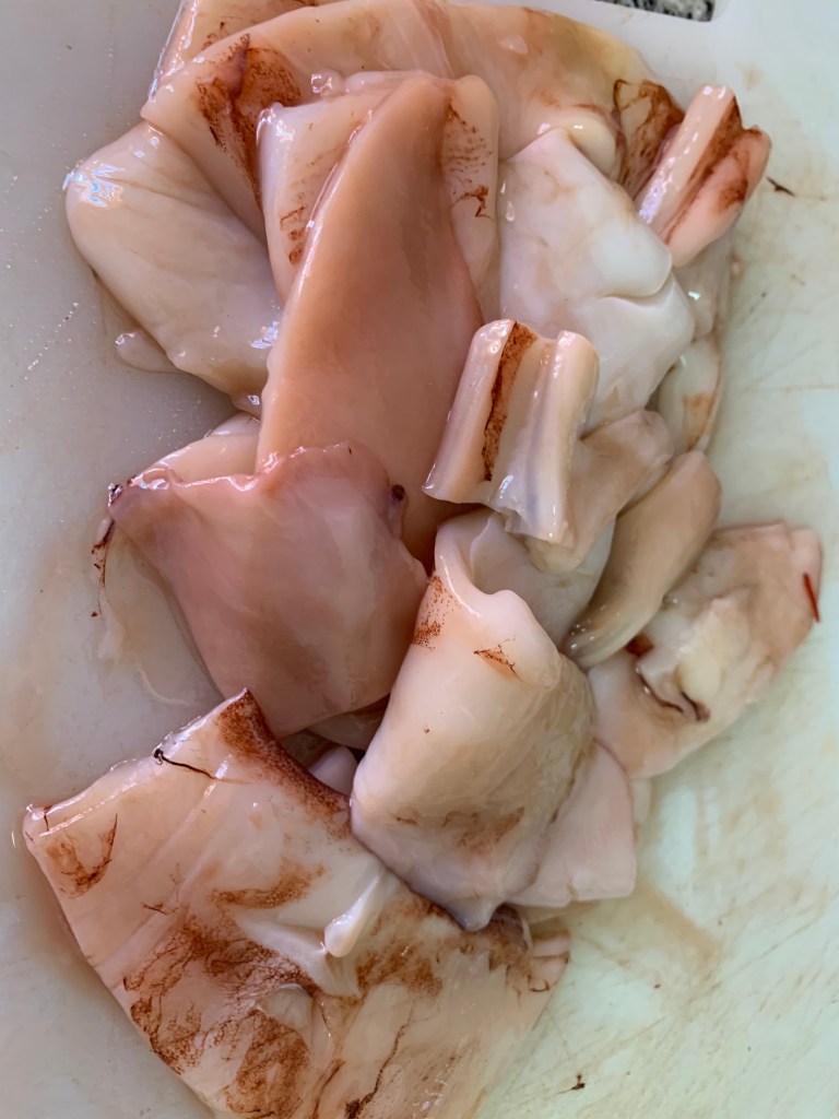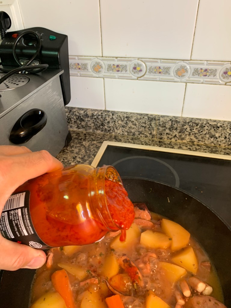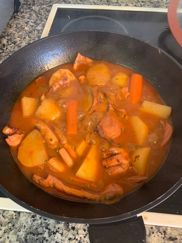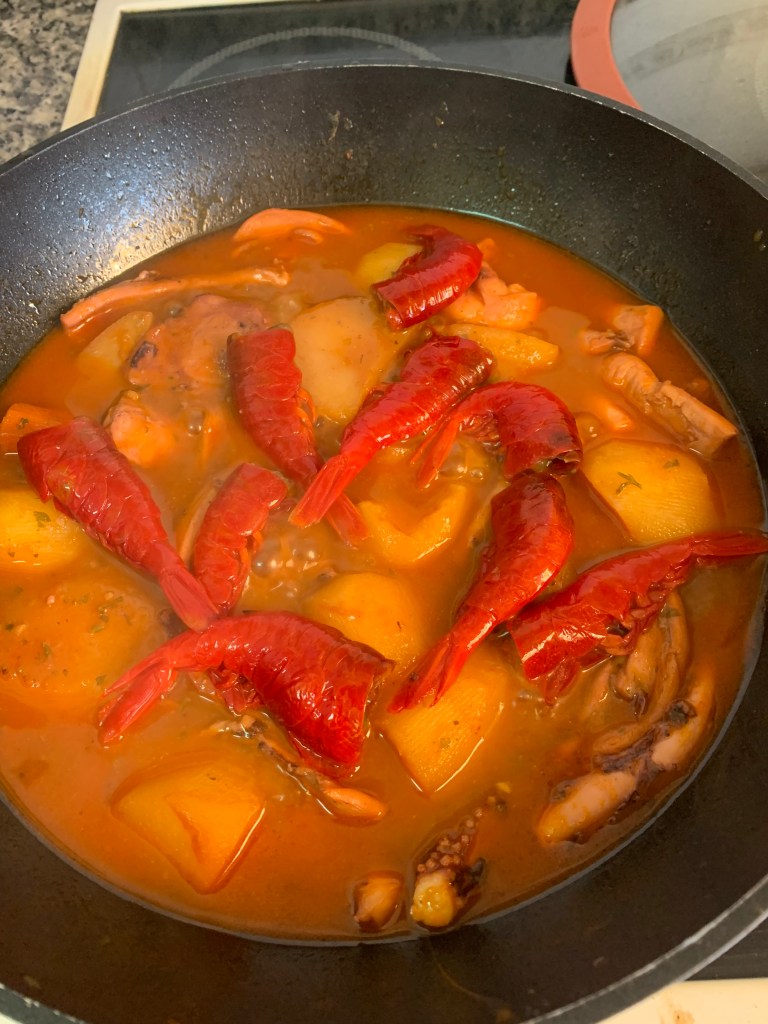 Ingredientes: 1 pota (calamar gigante) de un kg, 3 patatas, 5 camarones rojos de la costa (alternativa gambas o carabineros pequeños), ajo, perejil, sal, pimienta de distintos tipos, vino blanco, salsa de tomate frito.