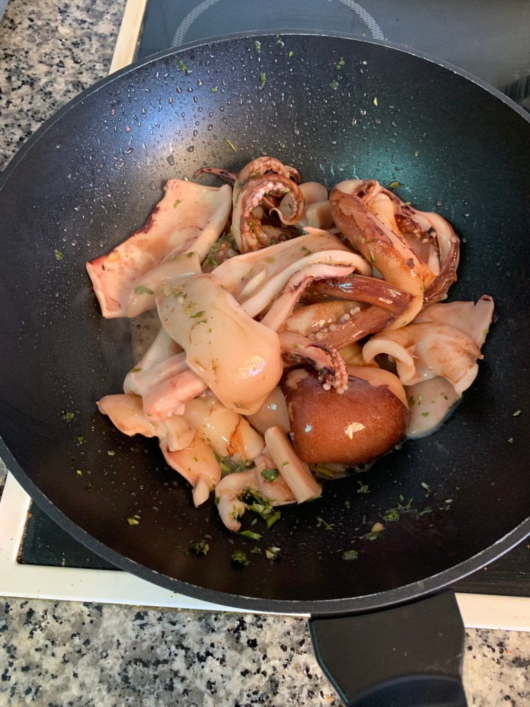 Limpiar bien el calamar quitando la piel y las ventosas más grandes. Cortarlo en piezas medianas. Preparar un poco de ajo picado y perejil y dorarlo en una sartén con un poco de aceite de oliva.