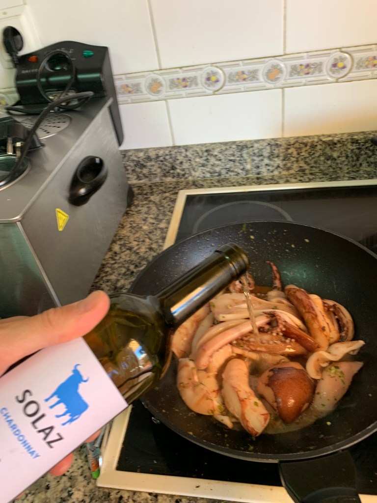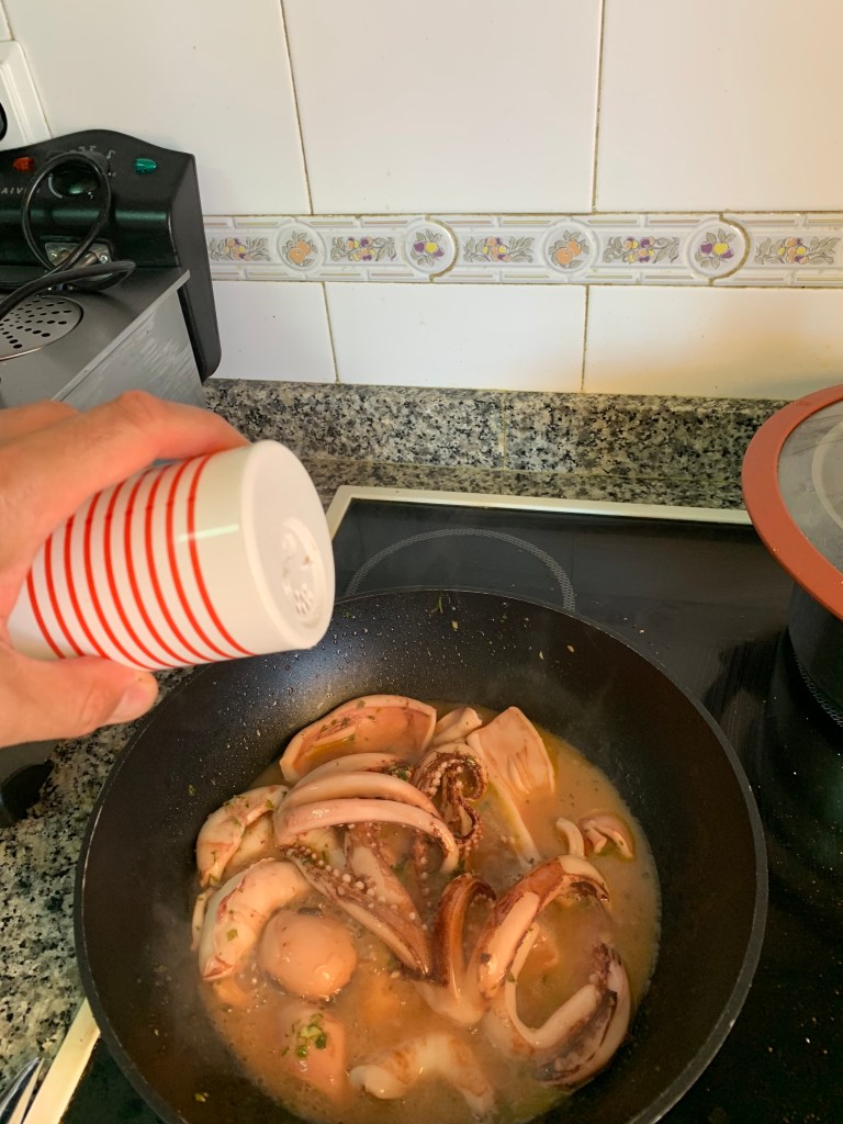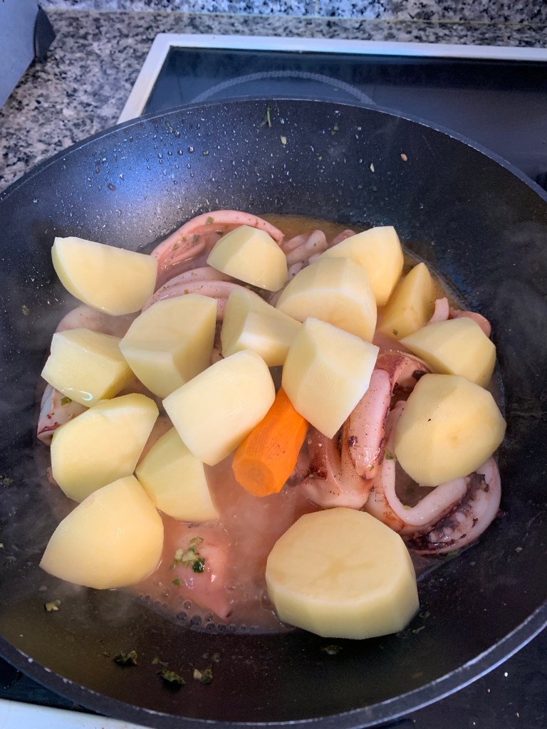 Añadir el calamar y las patatas troceadas con dos vasos de vino blanco, sal y pimienta, y cocer a media potencia si tenéis vitroceramica o inducción, o a fuego medio si tenéis gas.