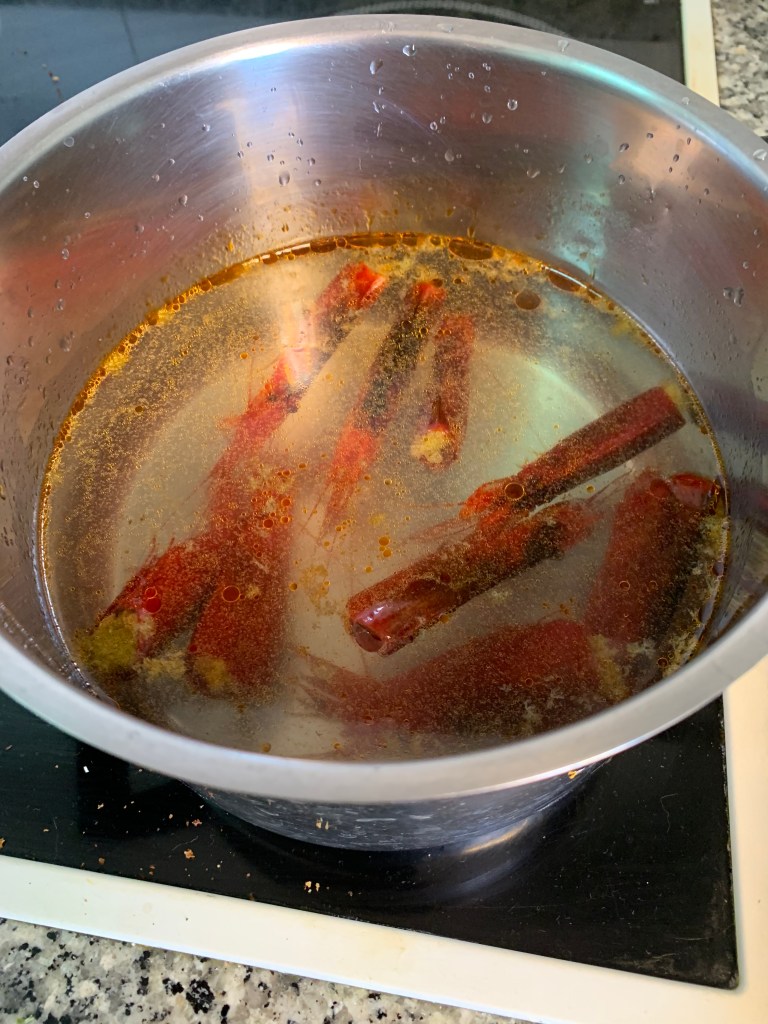 A cottura media aggiungere tre cucchiai di salsa di pomodoro. A parte tagliare alcune teste ai gamberi e preparare un brodo che verrà aggiunto alla nostra padella durante la cottura.