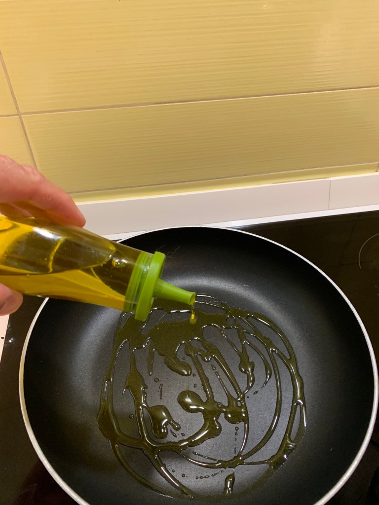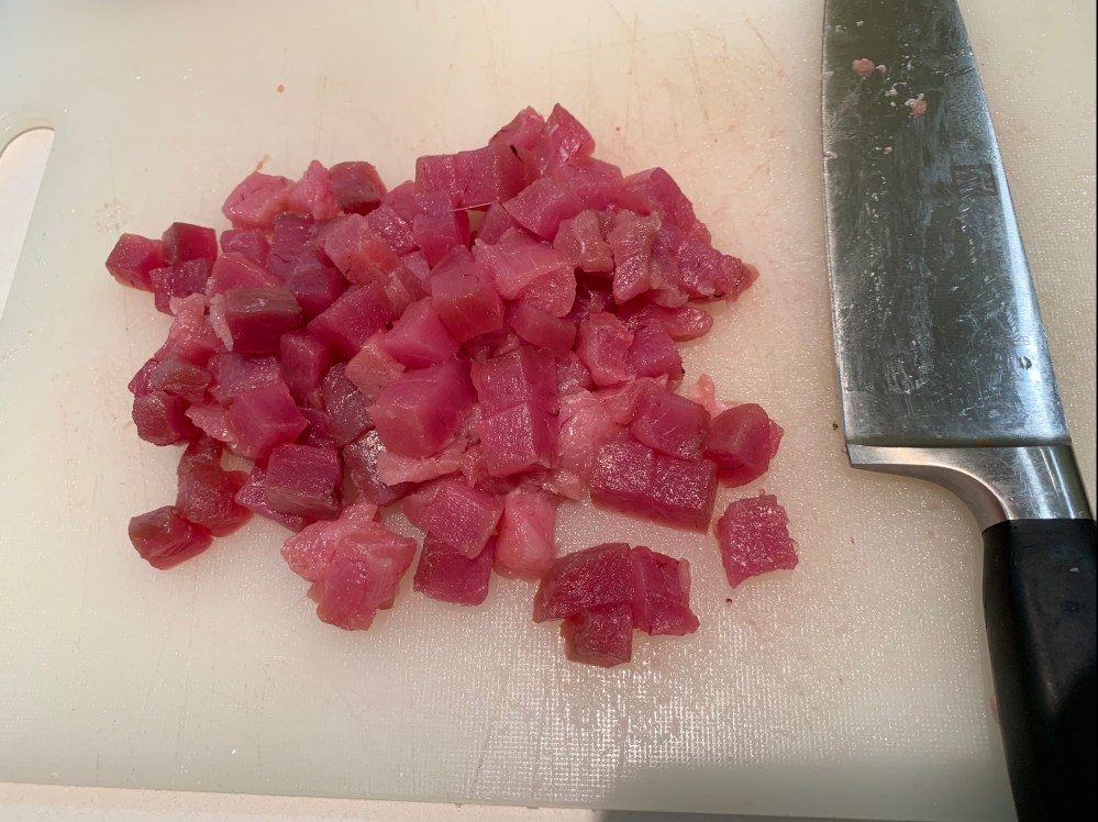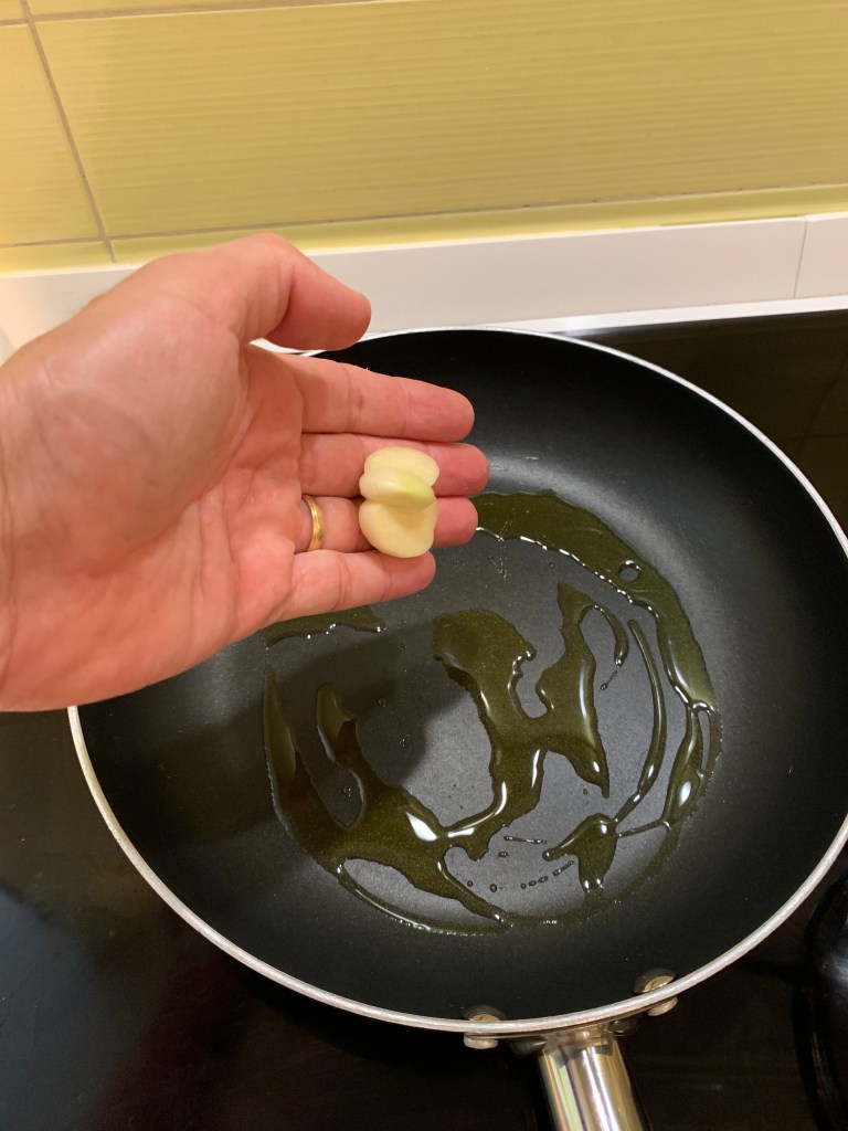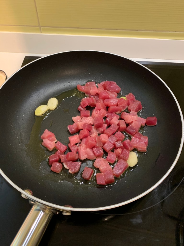 Tagliare il tonno a pezzetti non troppo piccoli, io taglio il tonno in strisce di 1 cm per 1 cm. in una padella far soffriggere uno spicchio d’aglio tagliato .