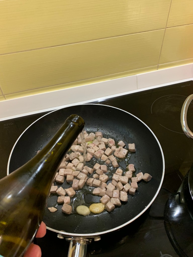 Una volta che l’aglio é dorato aggiungere il tonno, un pizzico di sale, mezzo bicchiere di vino bianco.