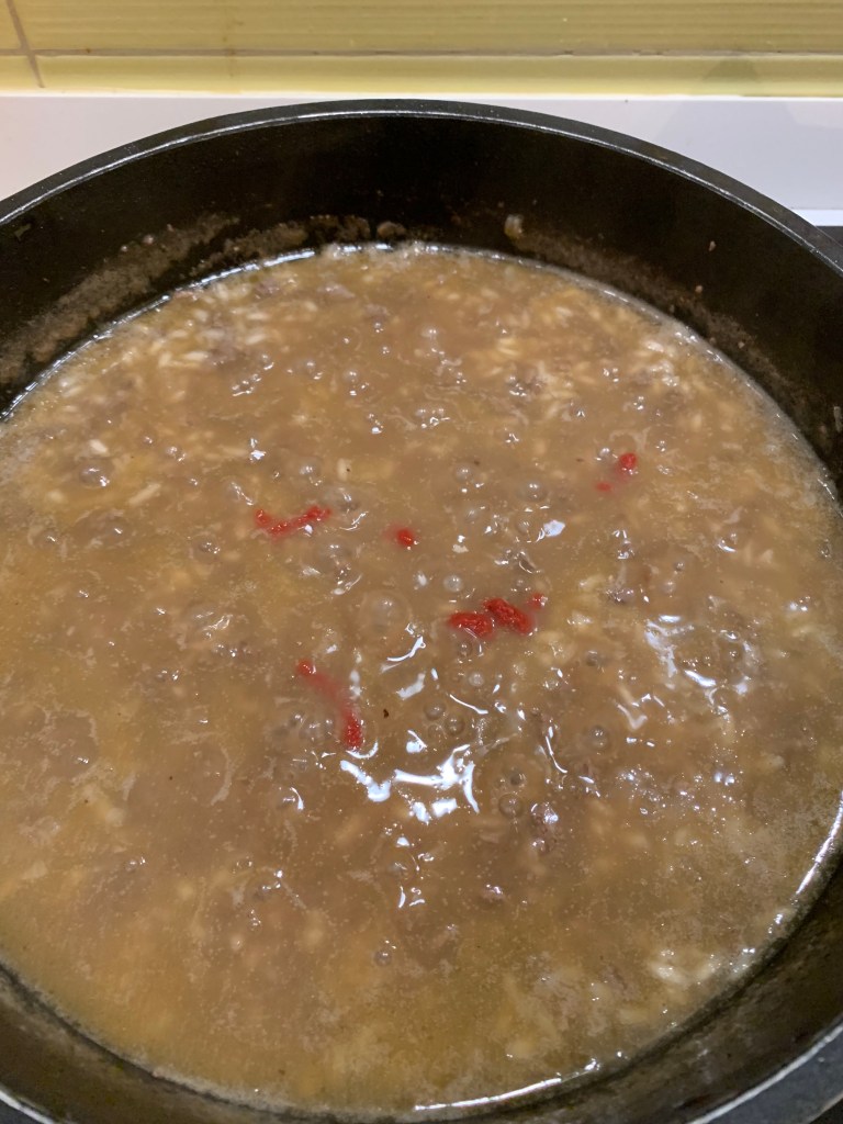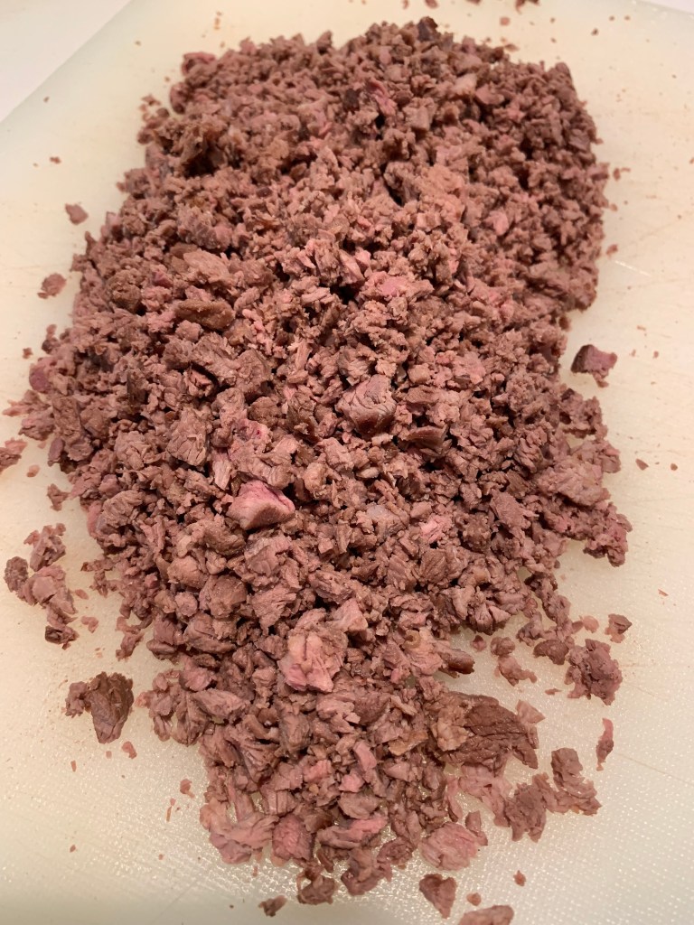 Far soffriggere la cipolla nel grasso, aggiungere il riso e il brodo e mescolare bene. Aggiungere quasi subito la carne per poterla amalgamare con il riso e renderla estremamente morbida.