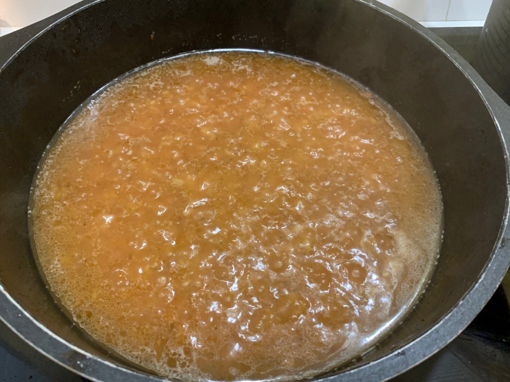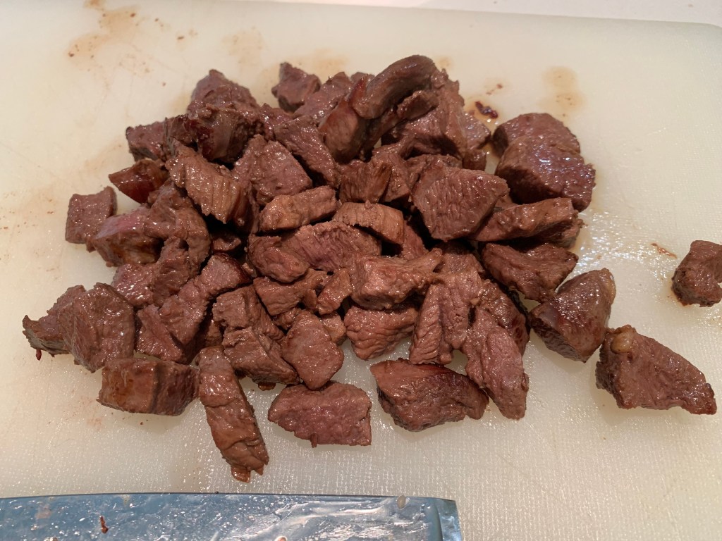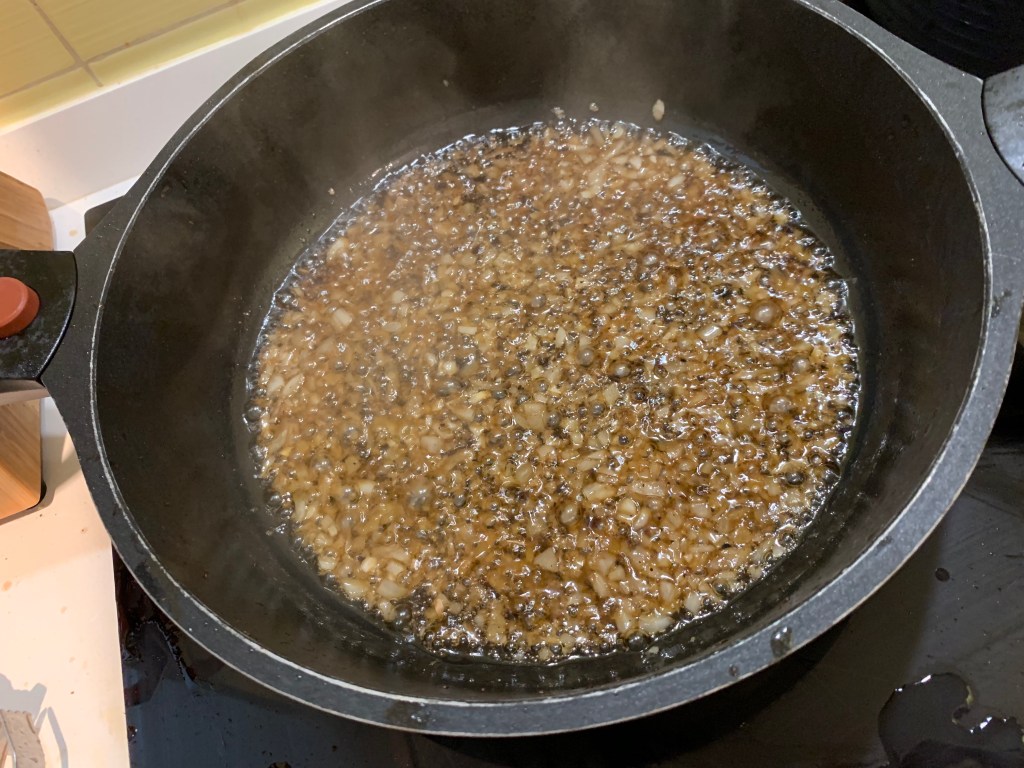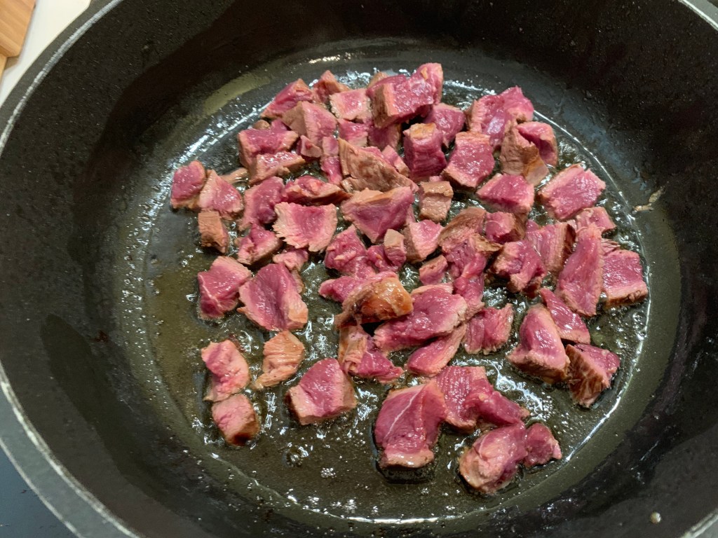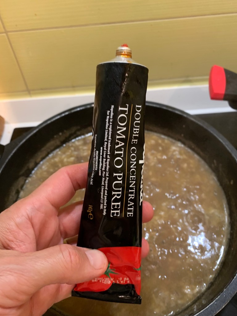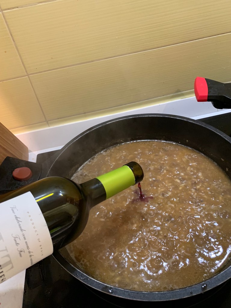A metá cottura aggiungere mezzo bicchiere di vino rosso, mi raccomando vino buono! E una noce di concentrato di pomodoro.