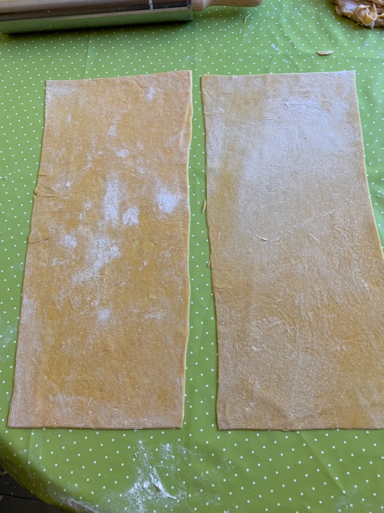 Una volta che il ripieno é pronto, si passa alla preparazione della pasta. Una volta ottenuta una palla elastica, la si lascia riposare almeno 30 minuti avvolta nella pellicola trasparente. Poi si stende con un mattarello o si fa passare in una macchina per fare la pasta fresca. Ovvio che con la macchina si ottiene una sfoglia perfetta e dello spessore giusto. Fatta a mano con il mattarello si deve prestare piú attenzione per lo spessore che dovrebbe essere cosí fine da potersi vedere il ripieno.