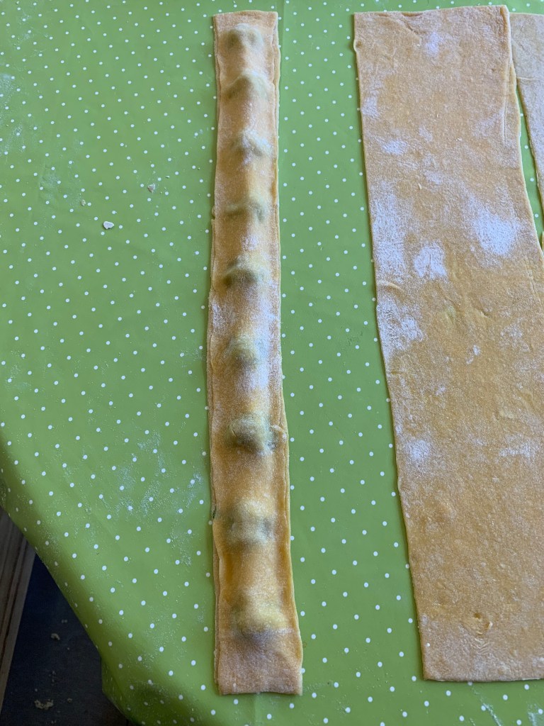 Posizionare delle palline di ripieno della grandezza di un piccolo acino d’uva. Tagliare una striscia di pasta e sovrapporla con attenzione. Si puó usare una forchetta per chiudere i bordi laterali.