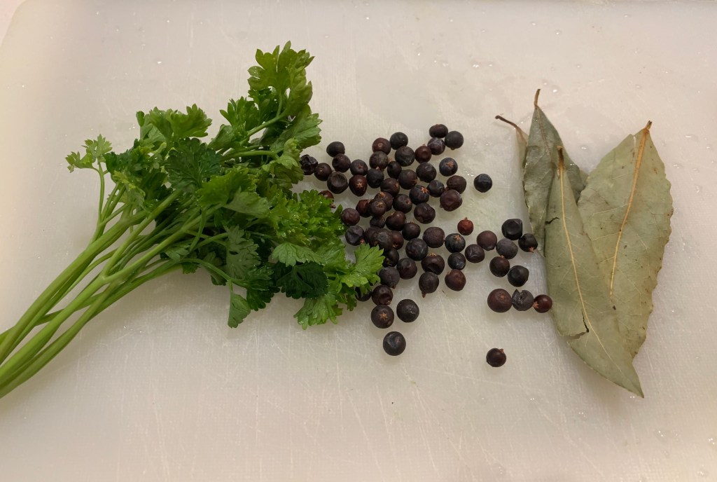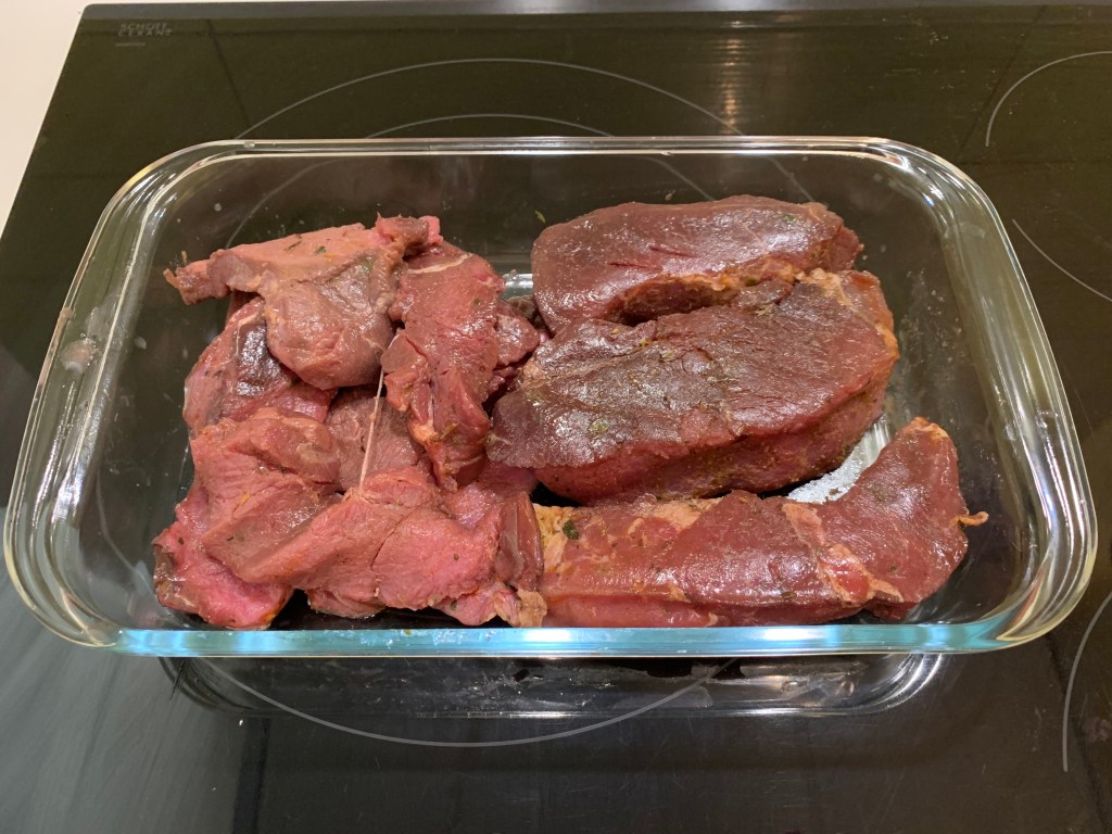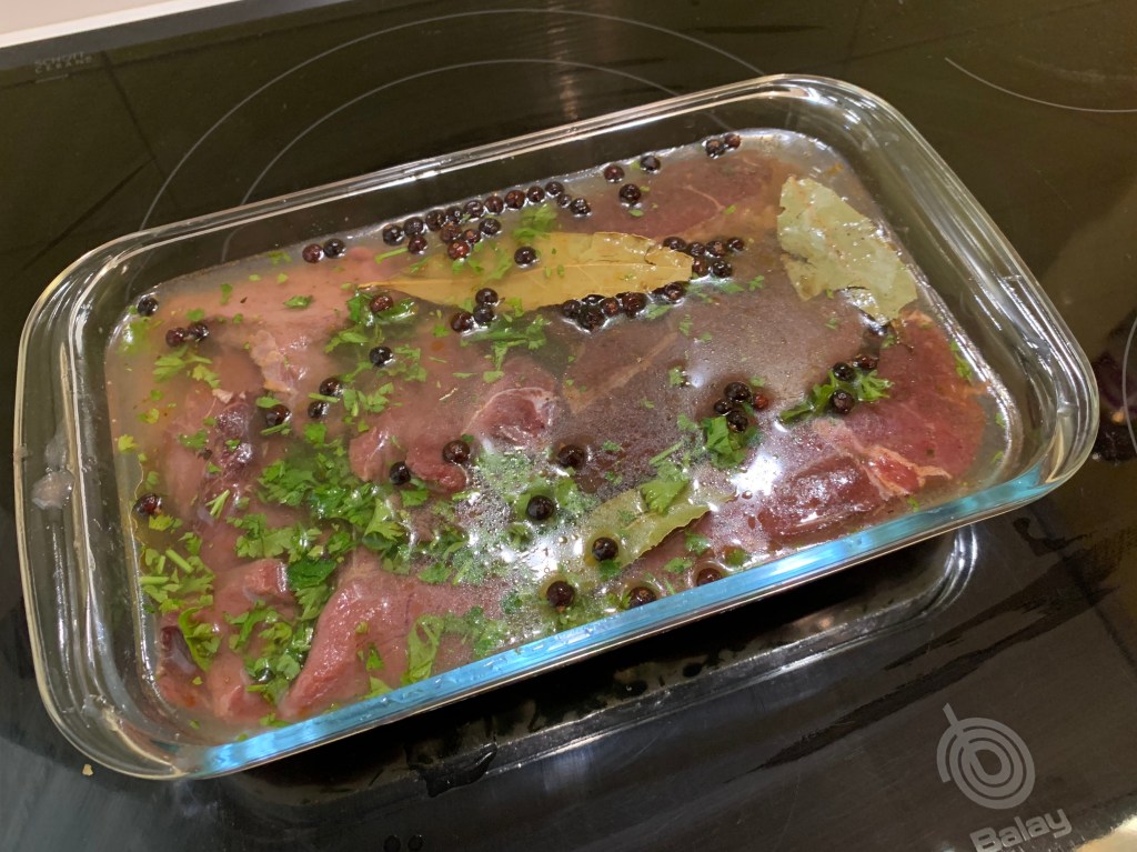 La sera prima di cucinare la carne di cinghiale, metterla a marinare con del buon vino bianco del prezzemolo, bacche di ginepro e alloro. Coprire con della pellicola trasparente e mettere in frigorifero. Il giorno dopo, almeno mezz’ora prima di cominciare a cucinare togliere la carne dal frigorifero.