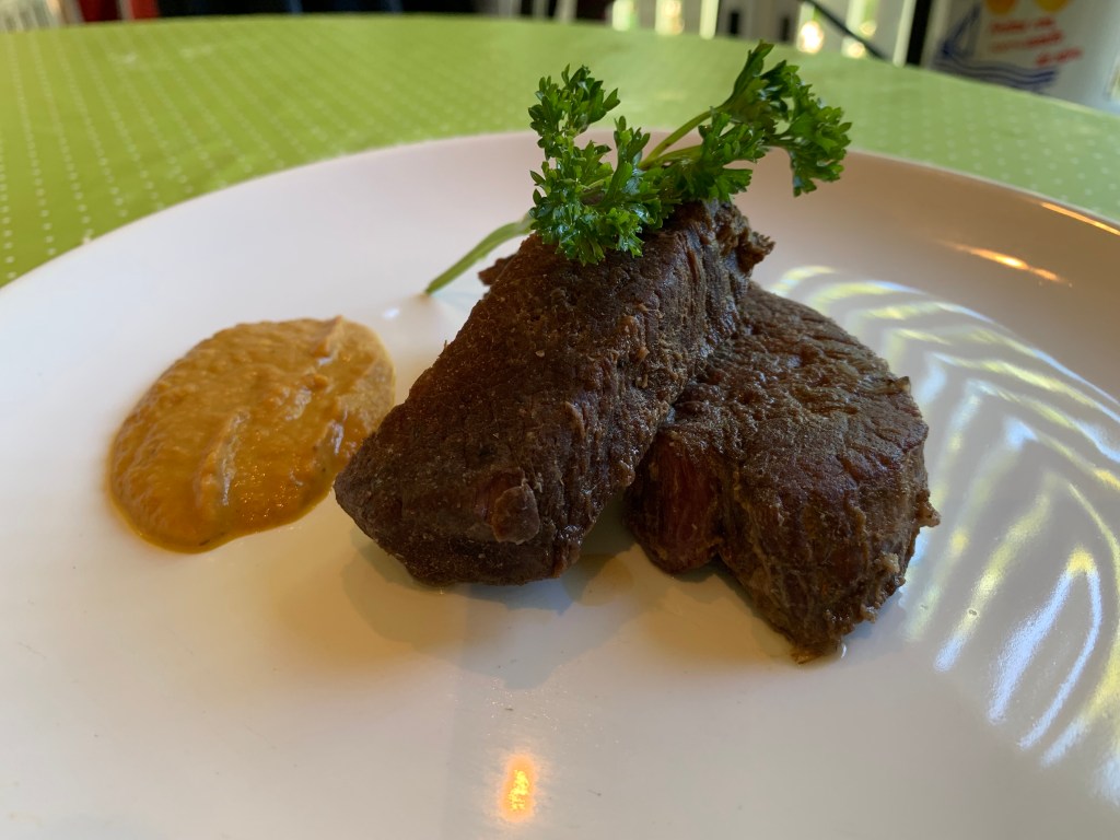 Ingredienti per 3 persone: 600 Gr di carne di cinghiale, preferibilmente filetto. Mezza cipolla bianca, vino bianco, sale, pepe, prezzemolo, bacche di ginepro, alloro, brodo di carne, una carota burro.