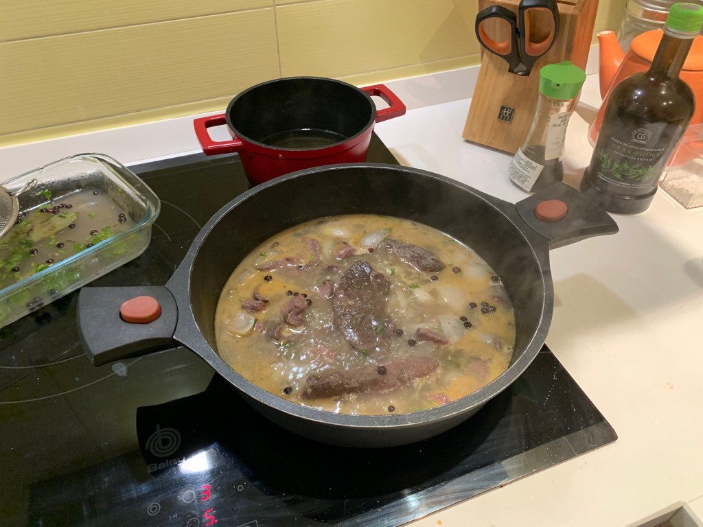 Preparare del brodo di carne e mentre il brodo si scalda, togliere la carne di cinghiale e metterla in una pentola antiaderente con un filo d’olio. Cuocere a temperatura media lasciando che il liquido della carne fuoriesca. Quando si nota che il liquido diminuisce, aggiungere il brodo di carne e il vino aromatizzato della marinatura in modo alterno, colandolo per lasciar fuori le spezie.
