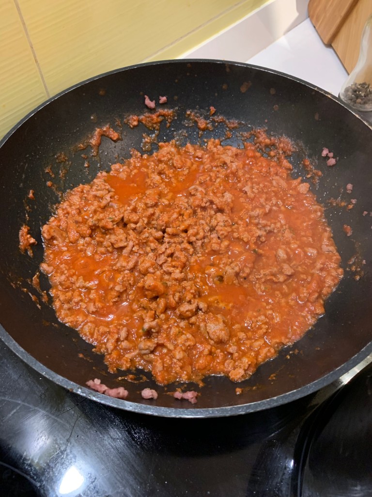 Per preparare il ragú, prendere un wok con la carne di maiale e la salsa di pomodoro. la Quantitá deve essere tale da dare solo un po’ di colore, non esagerare con la salsa. Un pizzico di pepe e sale e lasciare cuocere fino a quando l’acqua della salsa si riduce. Se i pezzi di carne sono troppo grandi, passare un minipimer leggermente mentre si termina la cottura.
