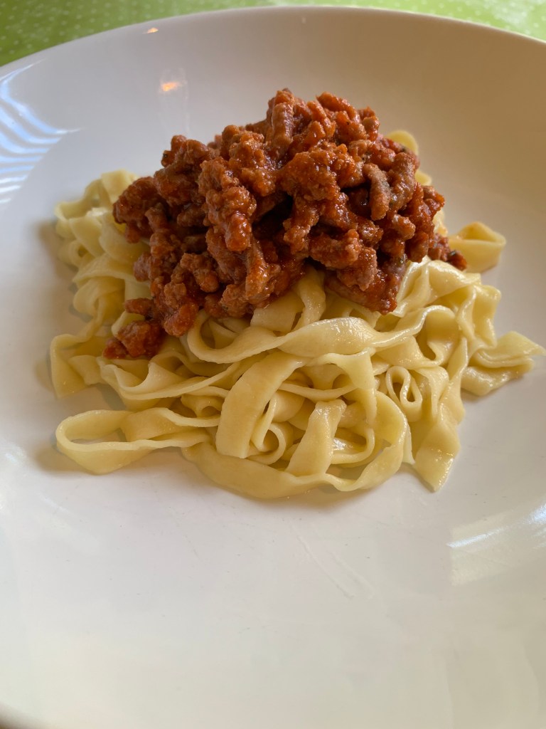 Ingredienti per 4 persone: per la pasta: 300 grammi di farina 00 tre uova un po’ di acqua tiepida e sale. In generale io uso un uovo per 100 grammi di farina. Per il ragú: 300 grammi di carne di maiale aromatizzata con del prezzemolo, salsa di pomodoro e pepe.