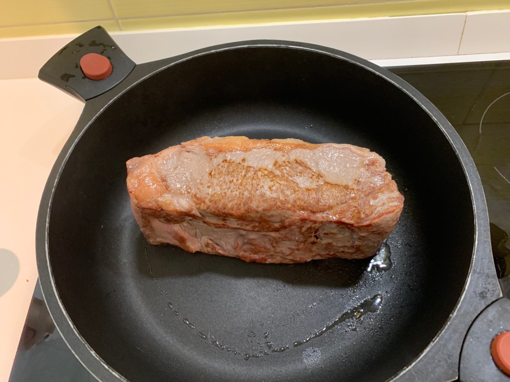 Scaldare una pentola o una padella antiaderente e mettere il pezzo di carne con un po’ di sale. Scottare tutti i lati per “sigillare” la carne ed evitare che si secchi.