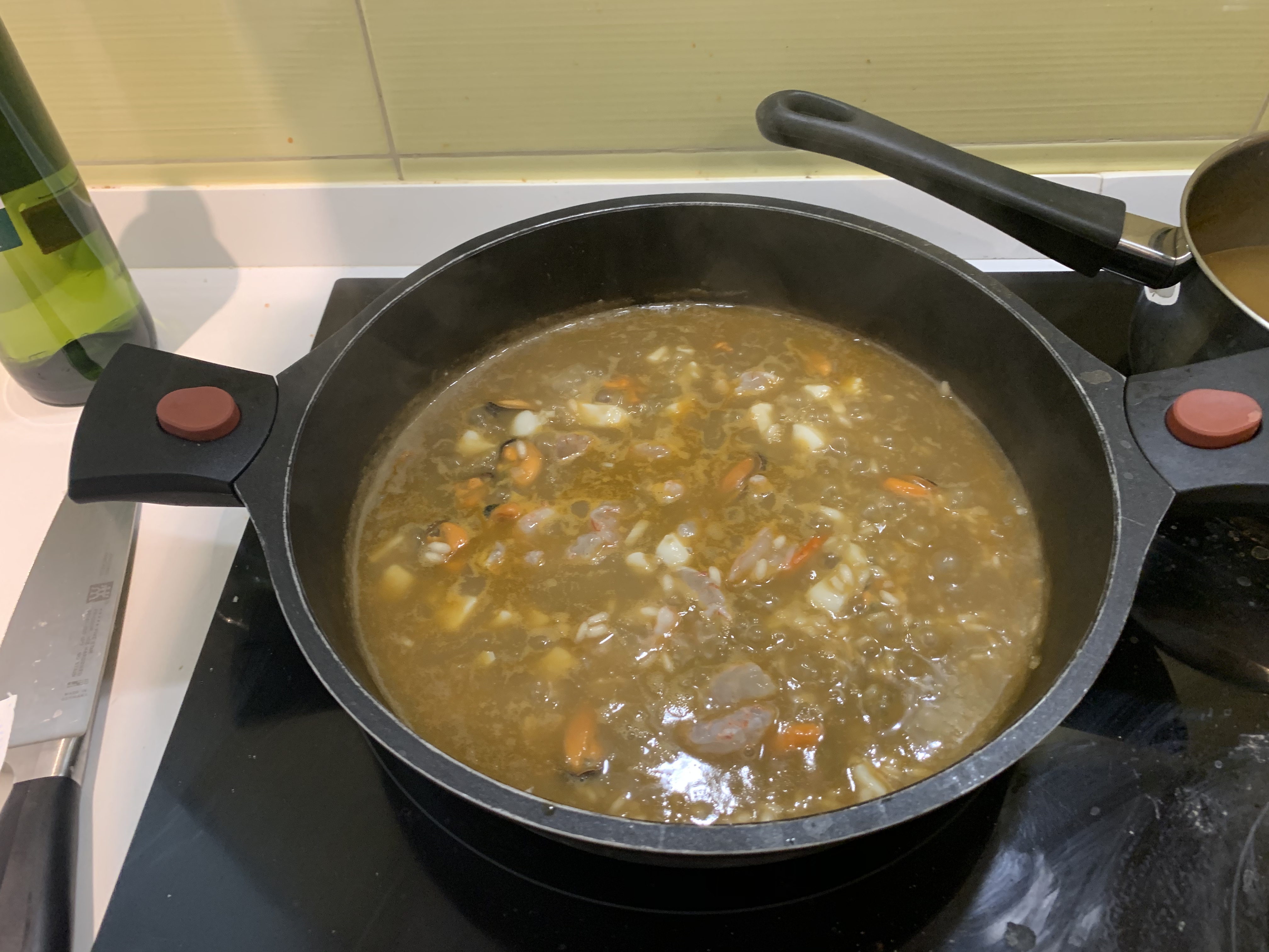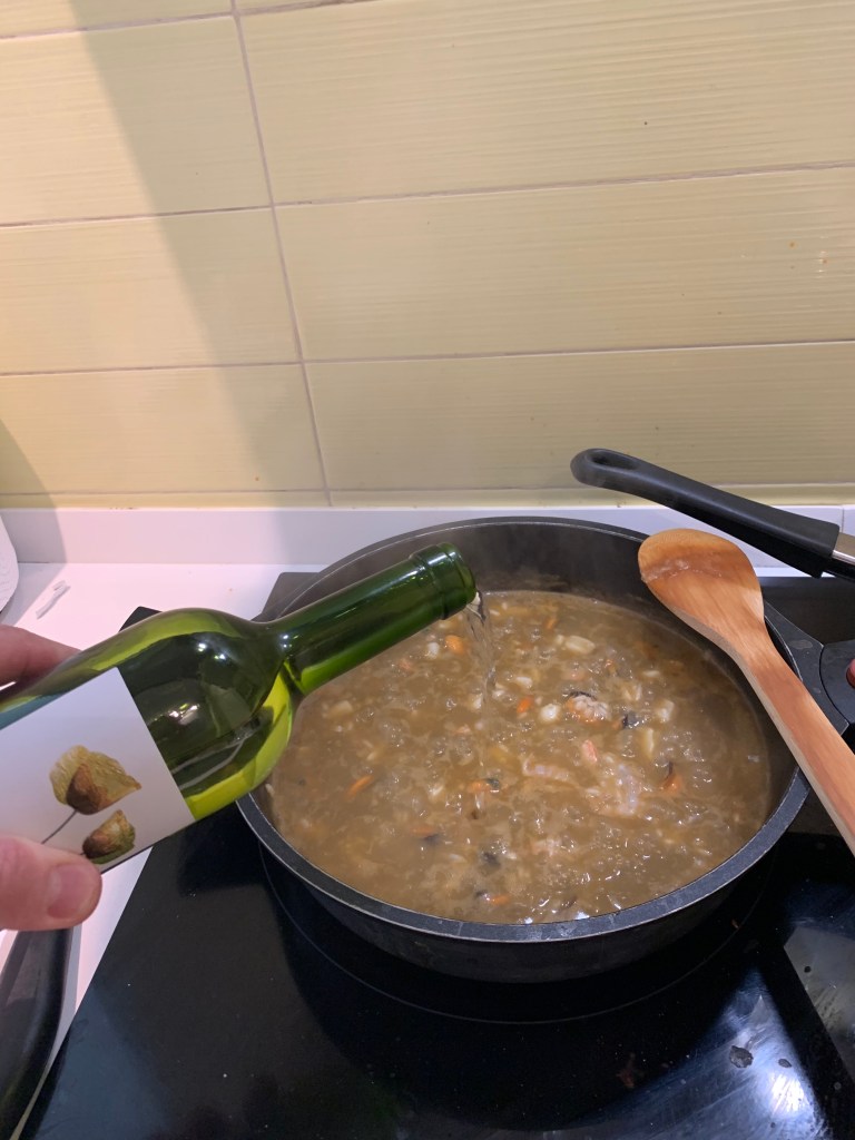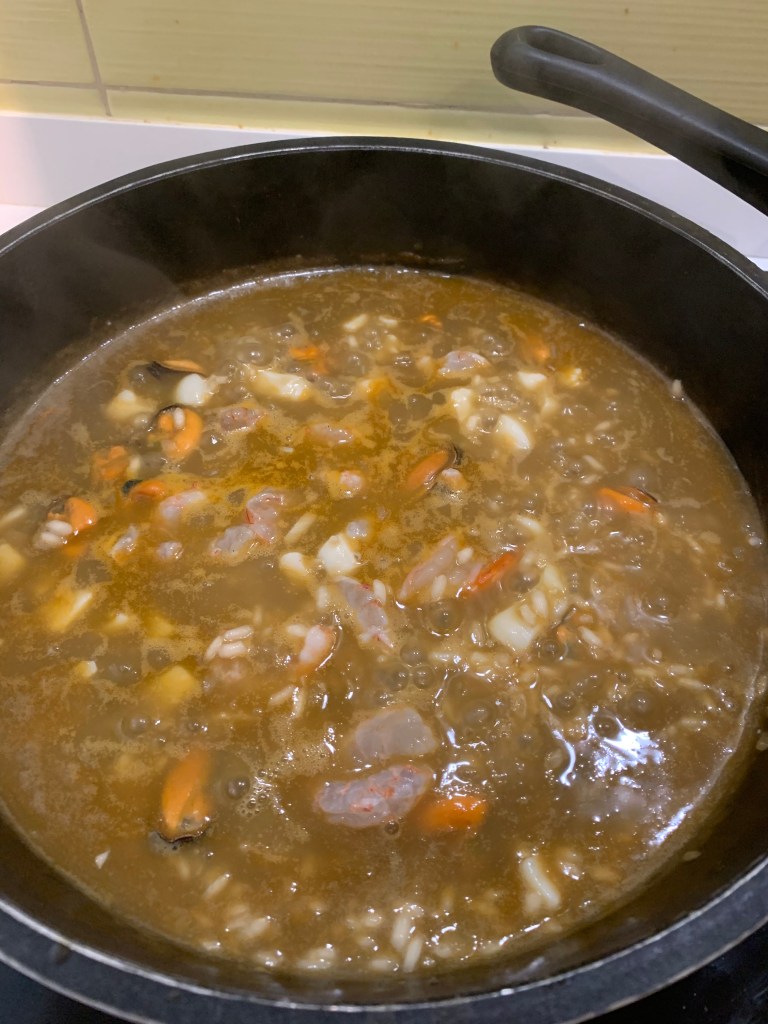 Un po’ d’oglio d’oliva in una pentola per risotti e quando si scalta aggiungere l’aglio la cipolla e un po’ di sale. Una volta che il sofftritto comincia a dorare aggiungere il riso e cominciare ad aggiungere il brodo e la seppia che ha bisogno di cuocere un po’ di piú rispetto agli altri ingredienti. A metá cottura aggiungere le cozze e a 5 minuti dalla fine i gamberi. Aggiungere brodo e un po’ di vino bianco per dare sapore.