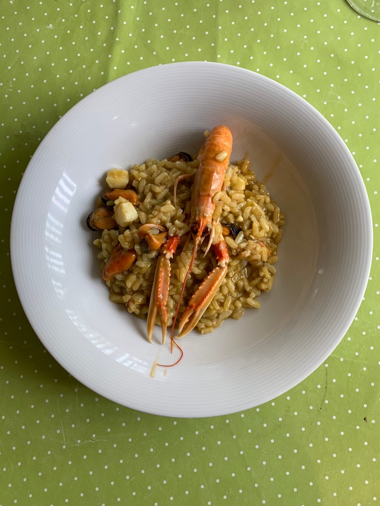 Dosi per 4 persone: 300 gr di riso per risotti, io di solito uso l’Arborio. Un quarto di cipolla, un aglio per il soffritto, una decina di gamberetti, una decina di cozze senza guscio, 150 gr di seppia tagliata a dadini, 5 o sei scampetti, brodo di pesce quanto basta, 50 gr di burro, oglio, sale e del vino bianco.