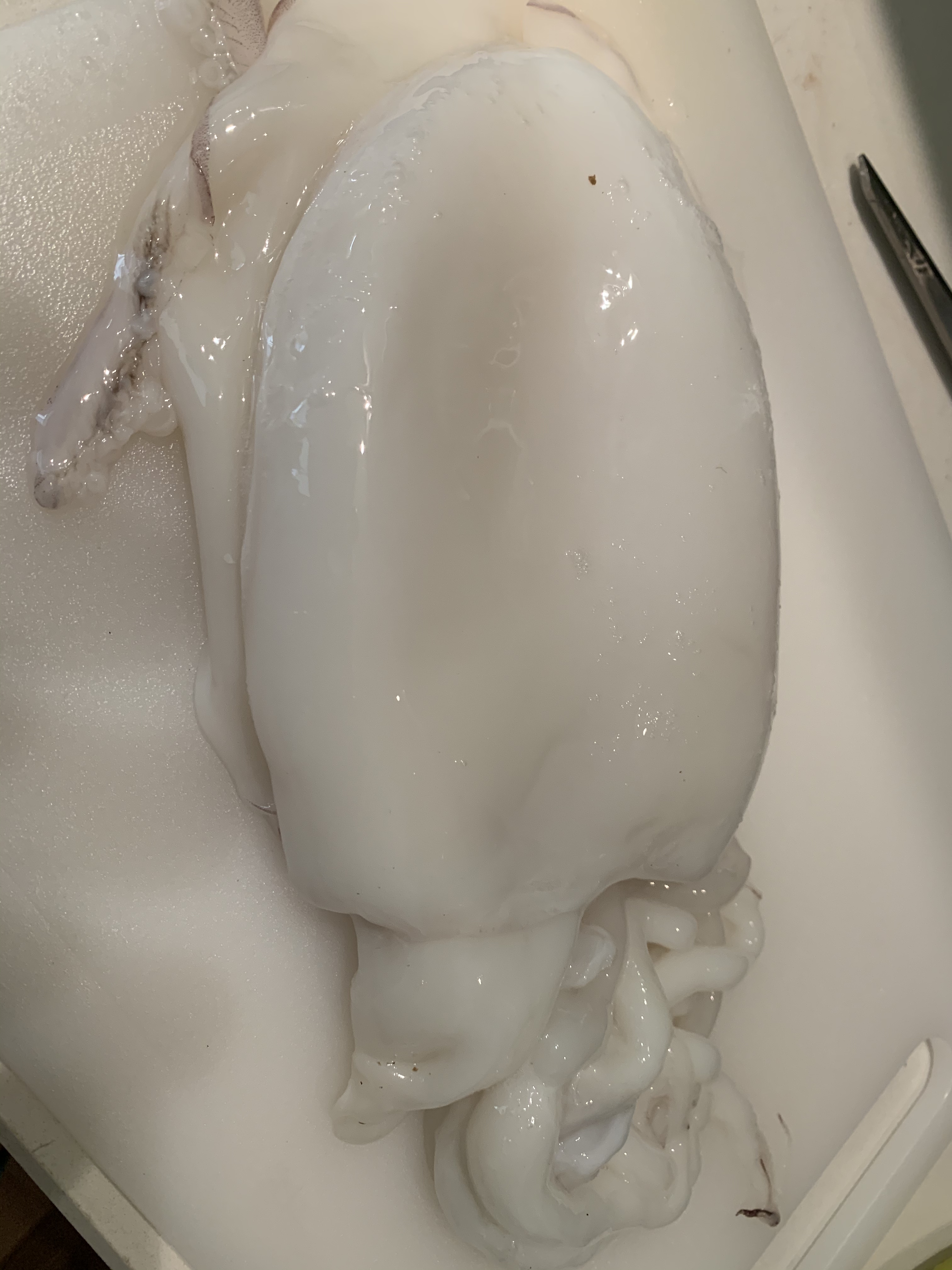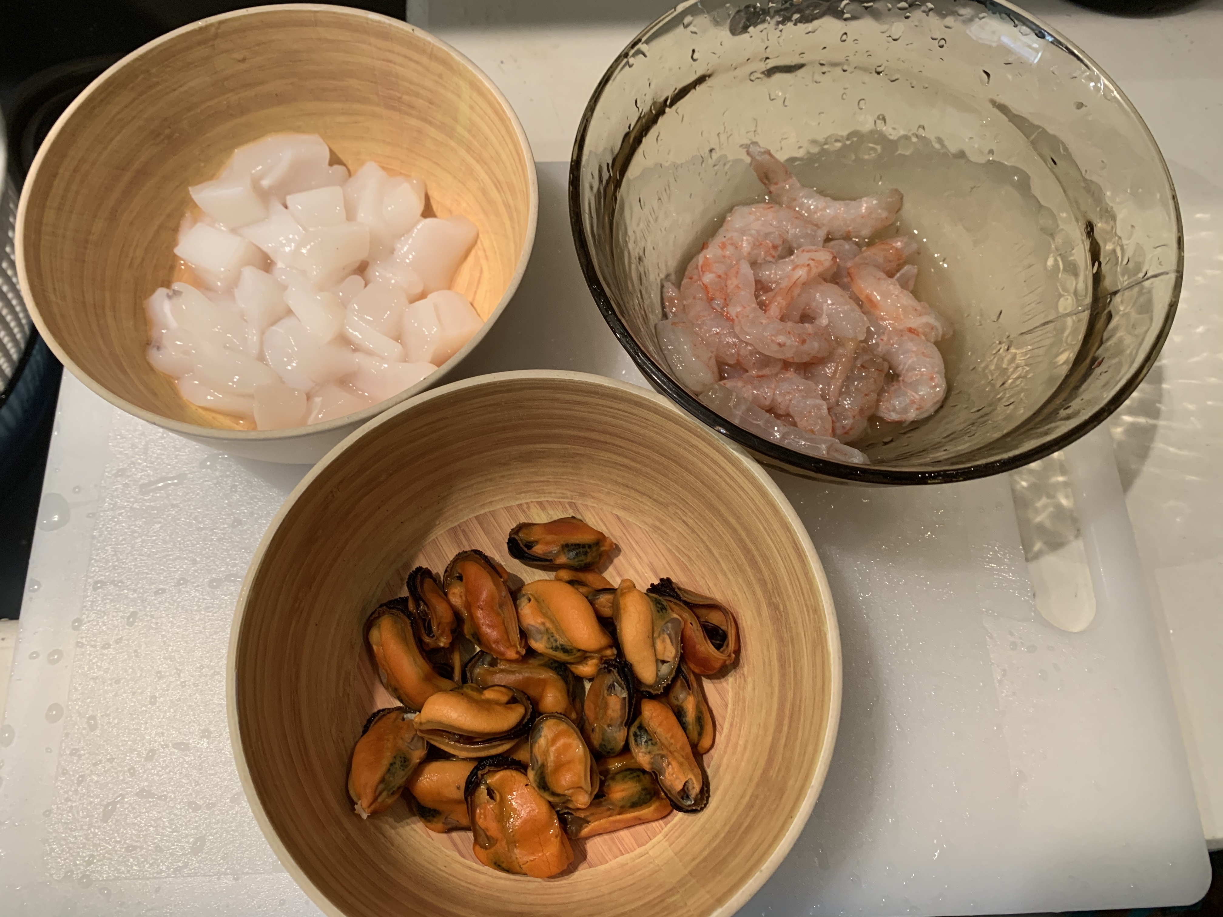 Tagliamo la seppia a dadini e puliamo i gamberi.