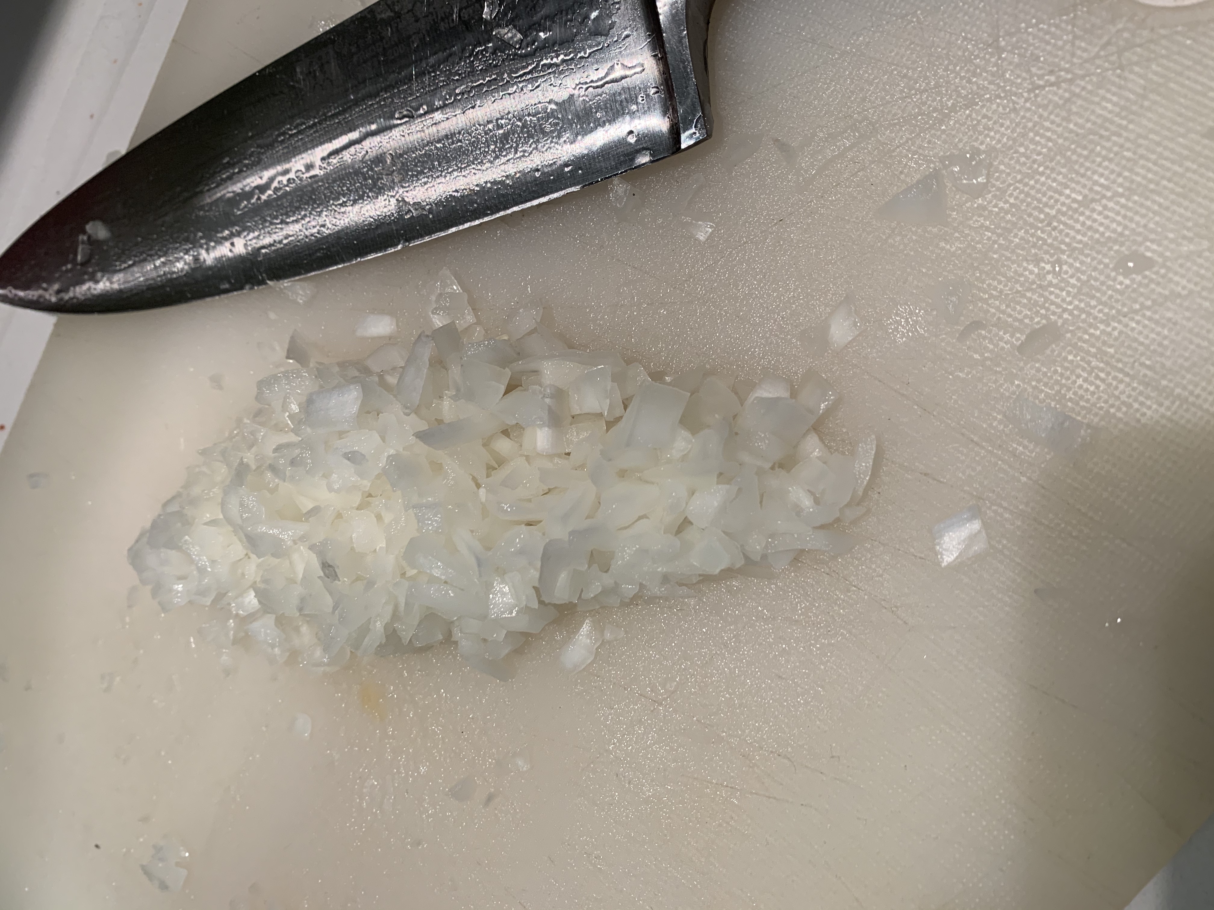 Nel frattempo mettiamo a bollire del brodo di pesce, circa un litro. prepariamo il soffritto pelando l’aglio e sminuzzandolo in piccoli pezzi e la cipolla.