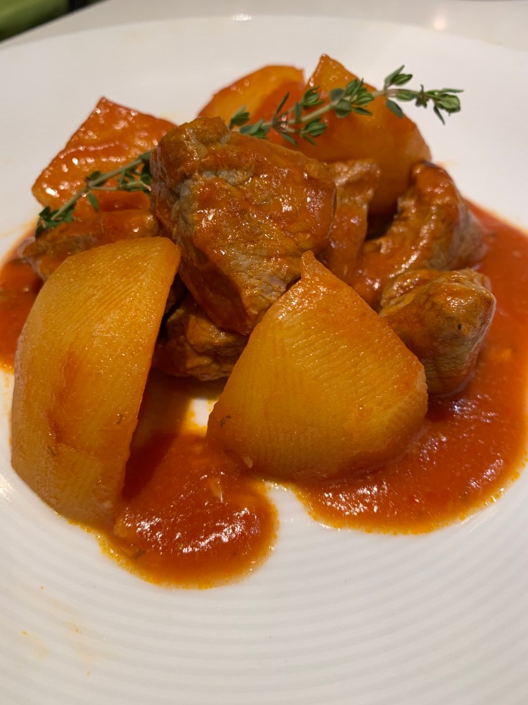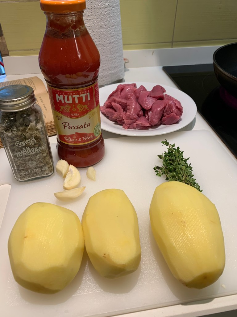 Ingredienti per 4 persone: 500 gr di spezzatino di vitello, 3 patate, due spicchi d’aglio, del timo, sale ed erbe provenzali, salsa di pomodoro, vino bianco, brodo di carne.