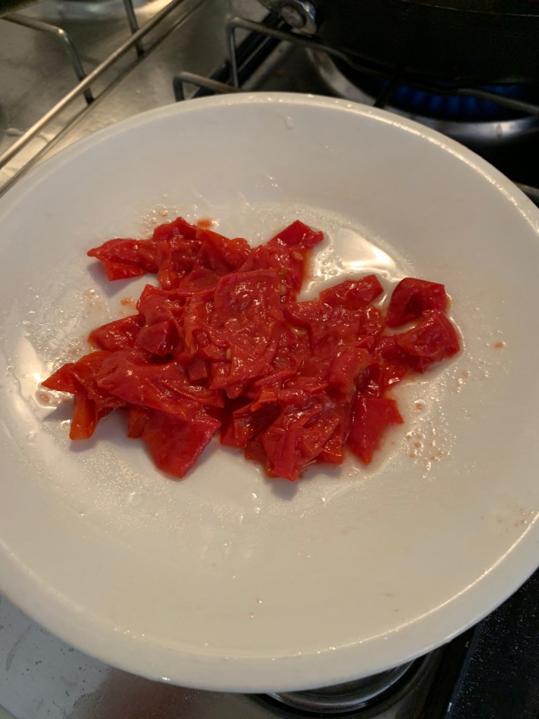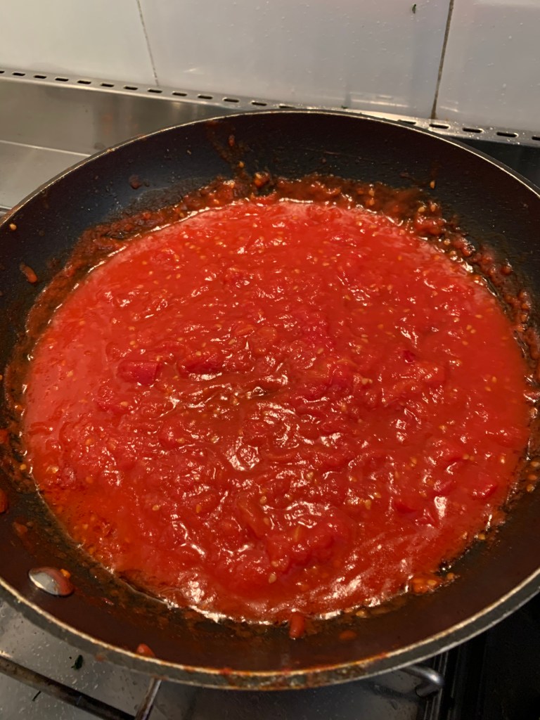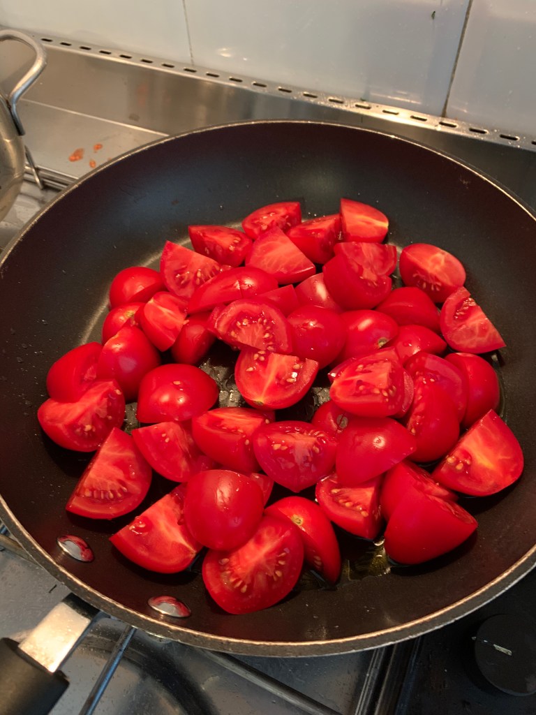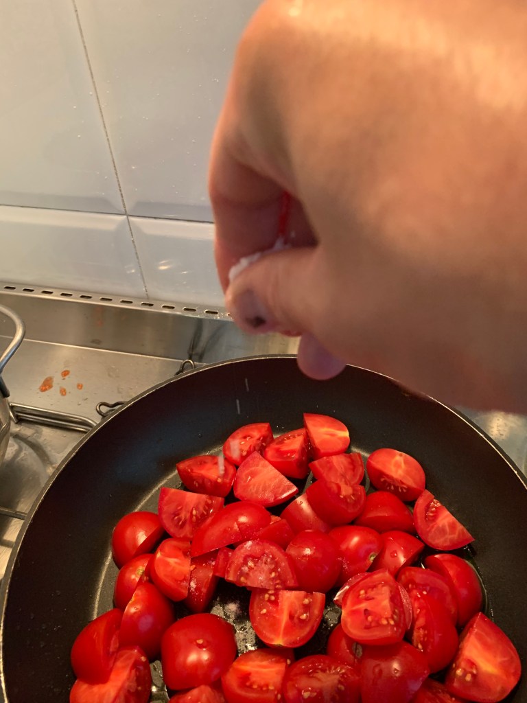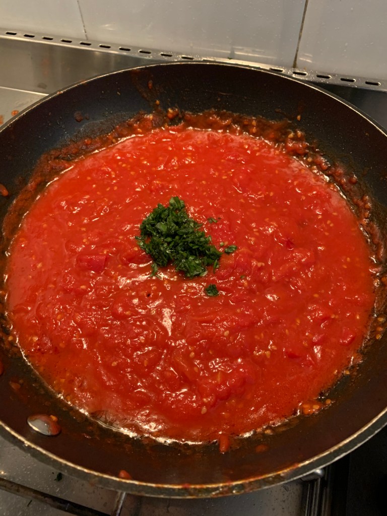 La salsa di pomodoro va preparata utilizzando una padella antiaderente e dei pomodori piccadilly, circa 500 gr e del basilico tritato e un po’ di sale. Si preparano i pomodori a tocchetti e si mettono in una padella con dell’olio d’oliva e un pizzico abbondante di sale. Quando i pomodori cominciano a cuocere si schiacciano con una forchetta e appena possibile bisogna separare la buccia dalla polpa. Questo accade dopo circa 20 minuti di cottura. Una volta separate le bucce aggiungere alcune foglie di basilico tritate finemente. Continuare a cuocere fino a quando la salsa raggiunge una buona consistenza.