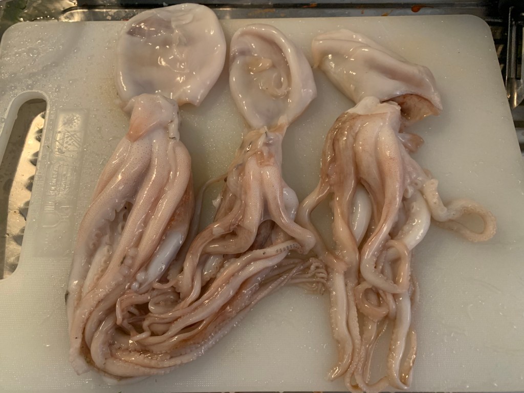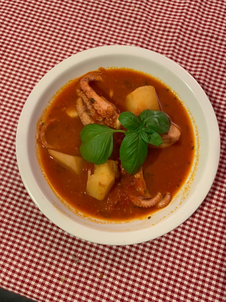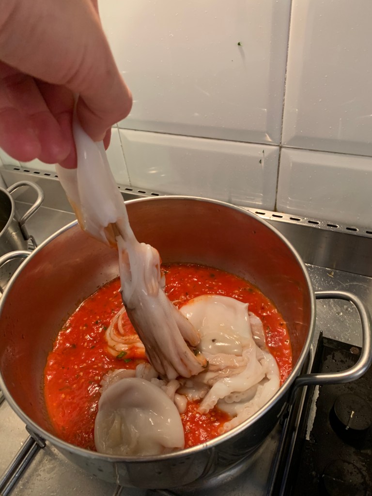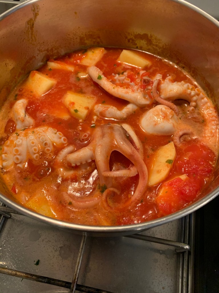 Ingredienti per 3 persone: 3 moscardini di 150 gr circa, salsa di pomodoro quanto basta, basilico, sale, pepe, un peperoncino piccante fresco (facoltativo), una patata grande, sale, olio d’oliva vino bianco.