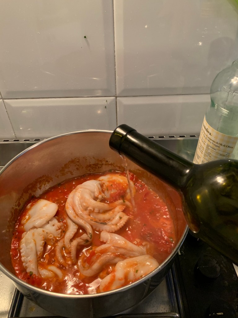 A questo punto laviamo i moscardini che devono anche essere puliti delle loro arti non commestibili e li aggiungiamo alla salsa con abbondante vino bianco, un po’ di pepe nero e i pezzi di patata.