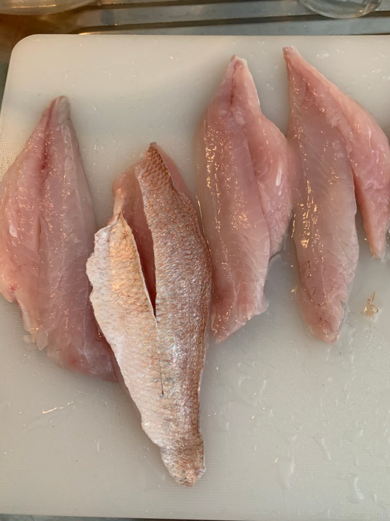 Ingredienti per 4 persone. 4 filetti di pagello, 200 gr. circa, una manciata di gamberi 100 gr pelati. Uno spicchio d’aglio, olio d’oliva, sale. Riso 300 gr.