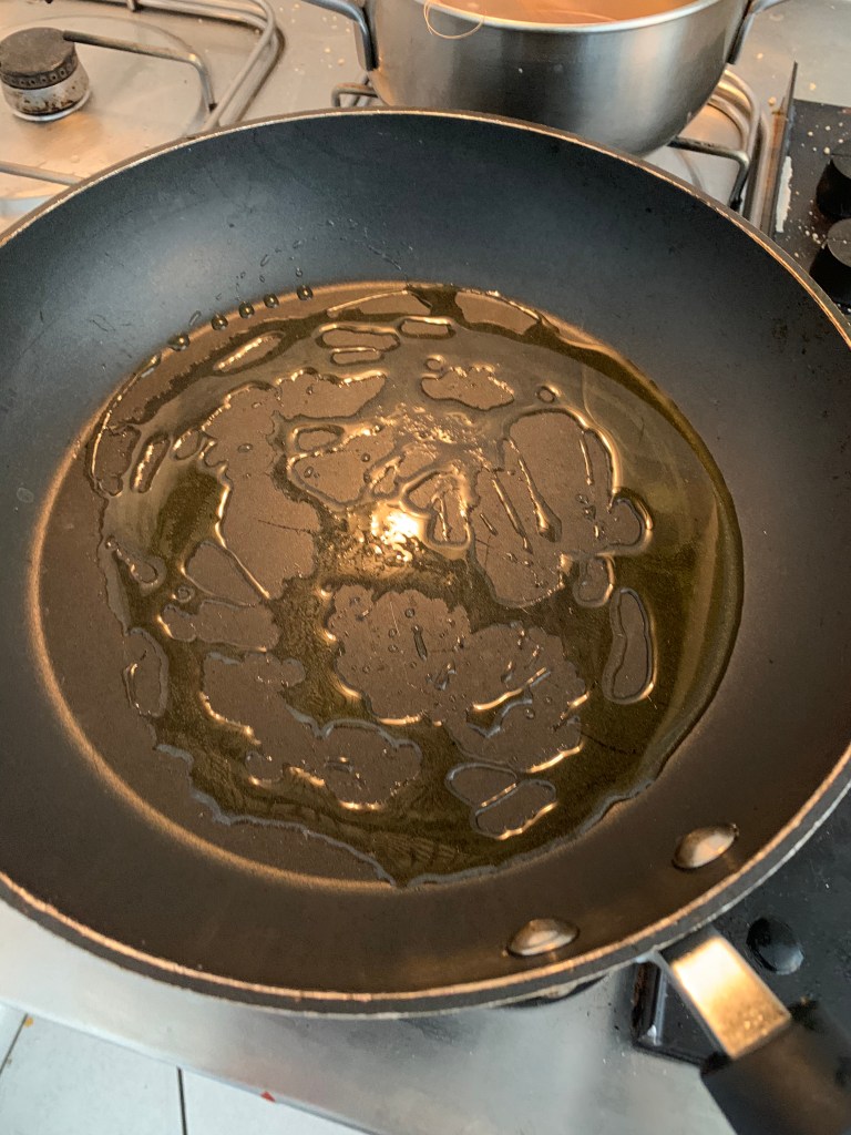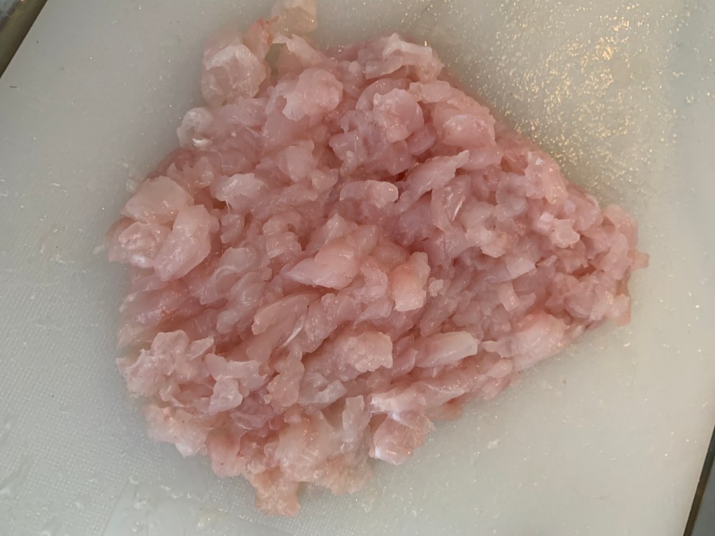 I filetti di pesce vanno preparati senza spine, fatelo fare dal vostro pescivendolo se non siete sicuri di poterlo fare voi. Importante é che non rimanga nessuna lisca. Controllate bene prima di passare a coltello. Bisogna tritare la carne fino ad ottenere dei pezzetti paragonabili alla carne tritata. Non piú piccoli perché cuocendo perdono di consistenza. Questa colta per il soffritto ho usato solo aglio perché la cipolla risulta a volte troppo forte e coprirebbe il sapore del pesce.