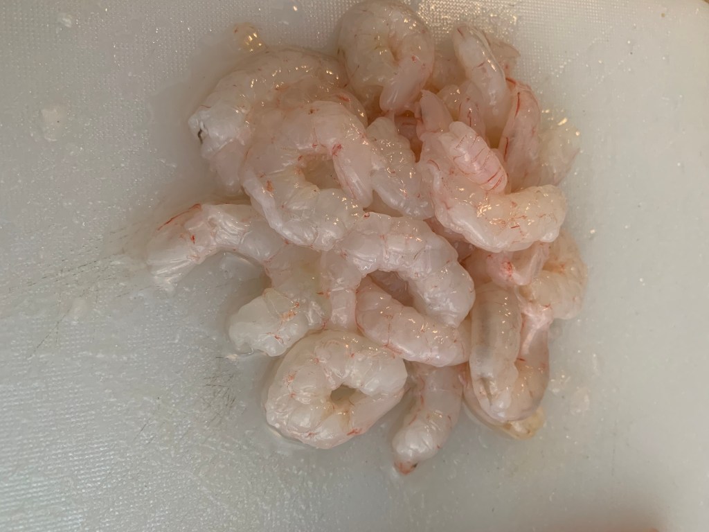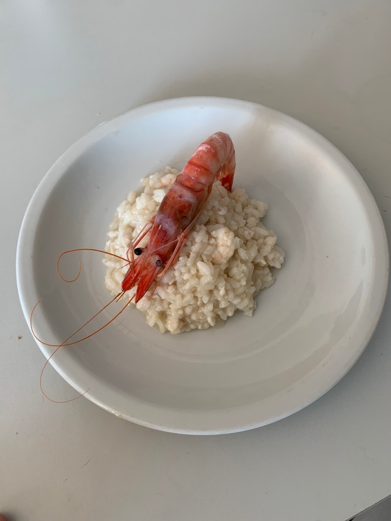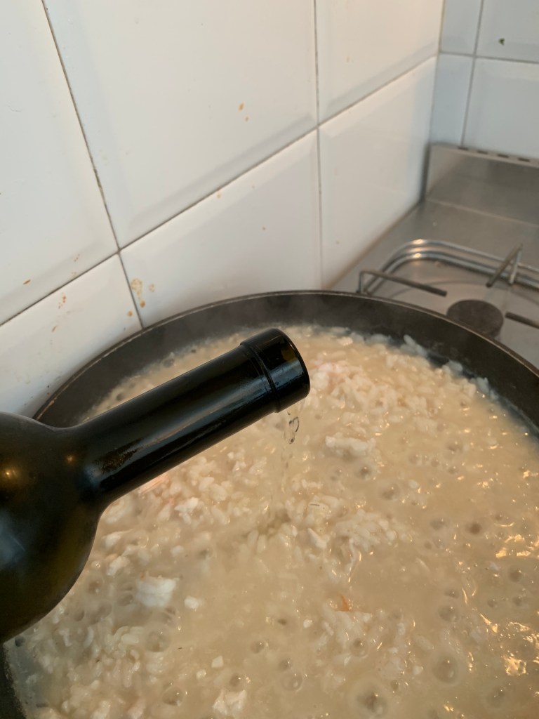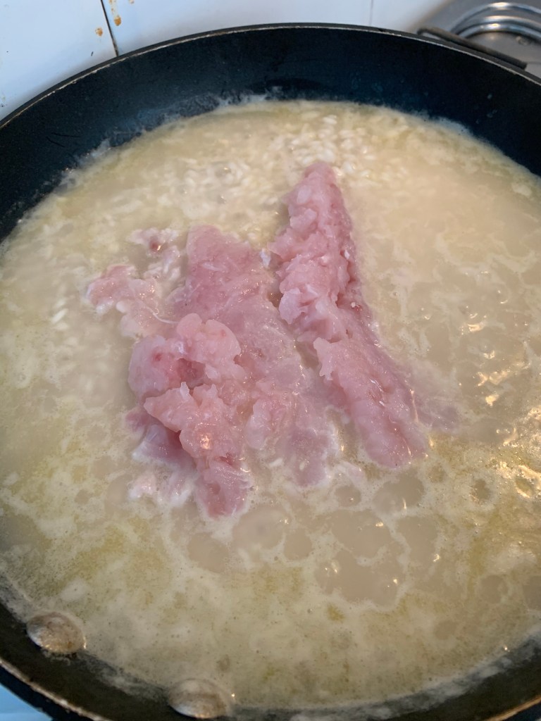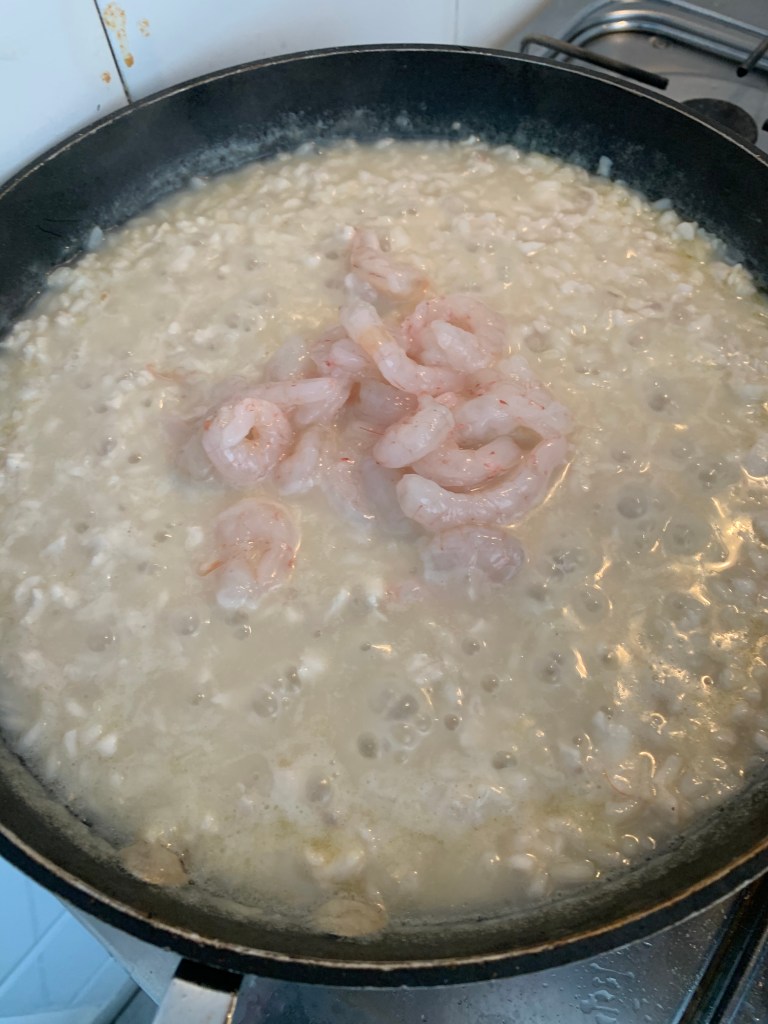 Passati alcuni minuti dall’aggiunta del riso, circa una decina, aggiungere la battuta di filetto di pagello, i gamberi pelati e un bicchiere di vino bianco.