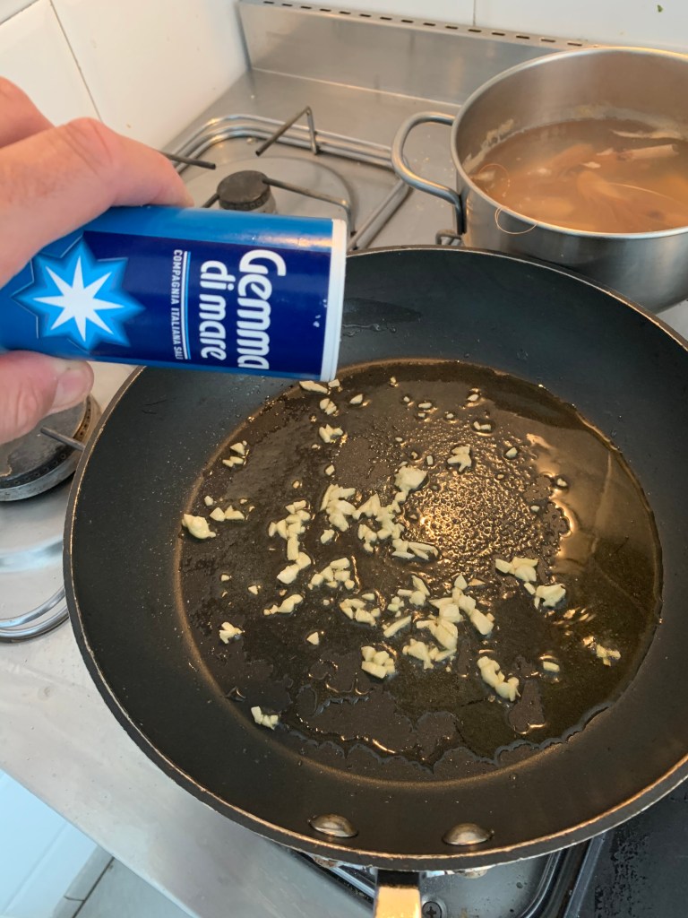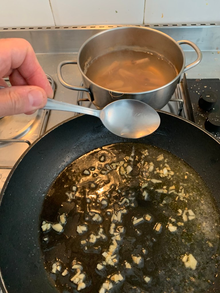 Scaldare la pentola, aggiungere olio e uno spicchio d’aglio tagliato finemente. Quando l’aglio comincia a dorare aggiungere il riso e del brodo di pesce.