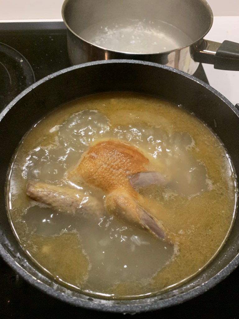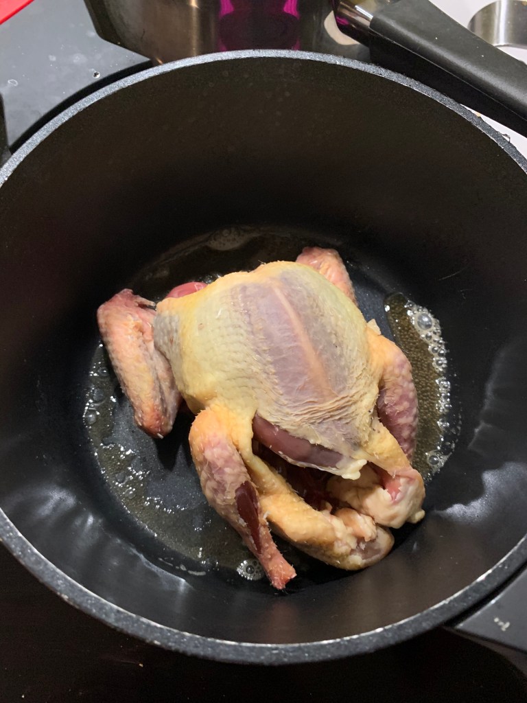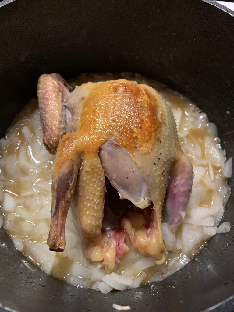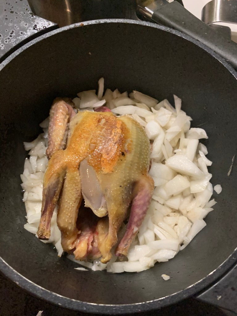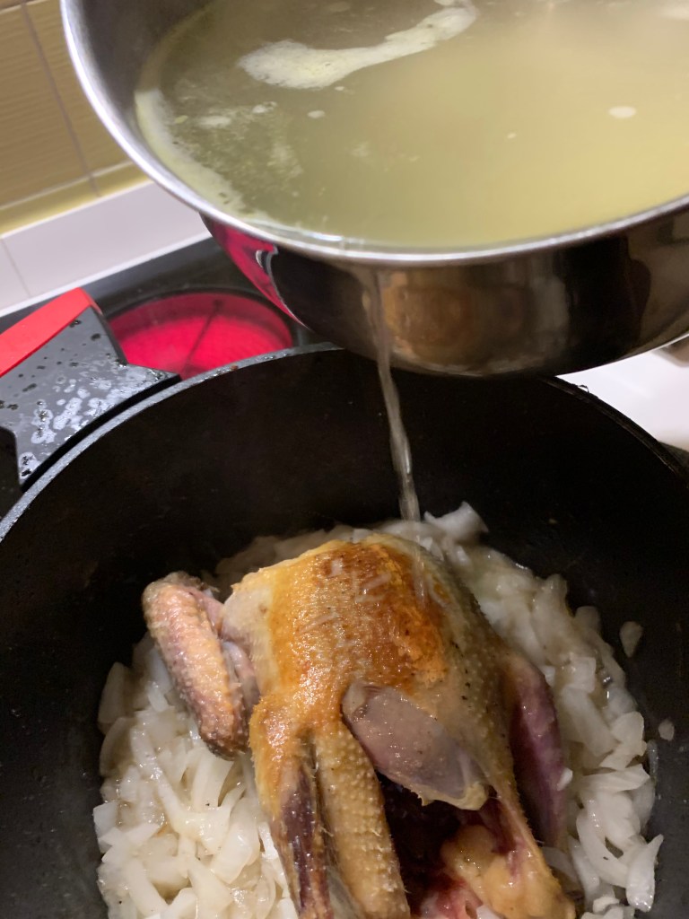 far rosolare il piccione con il burro e un po’ di olio d’oliva fino a quando raggiunge una leggera doratura. tagliare la cipolla in pezzi non troppo piccoli visto che con la cottura si riduce molto. Aggiungerla nella pentola con il brodo e controllare la cottura. Consiglio di coprire la pentola per facilitare la cottura.