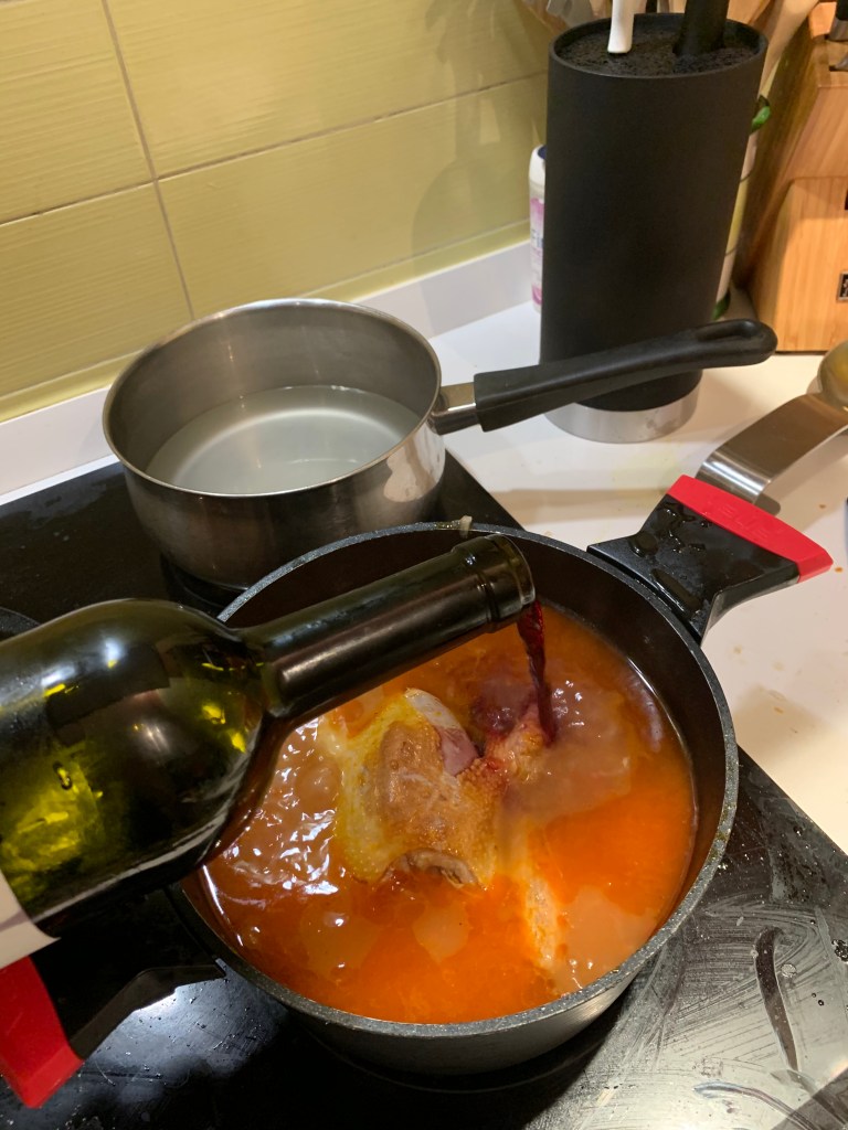 A metà cottura aggiungere il vino rosso, mezzo bicchiere è sufficiente.