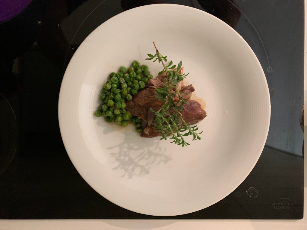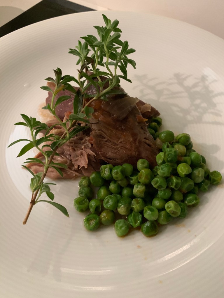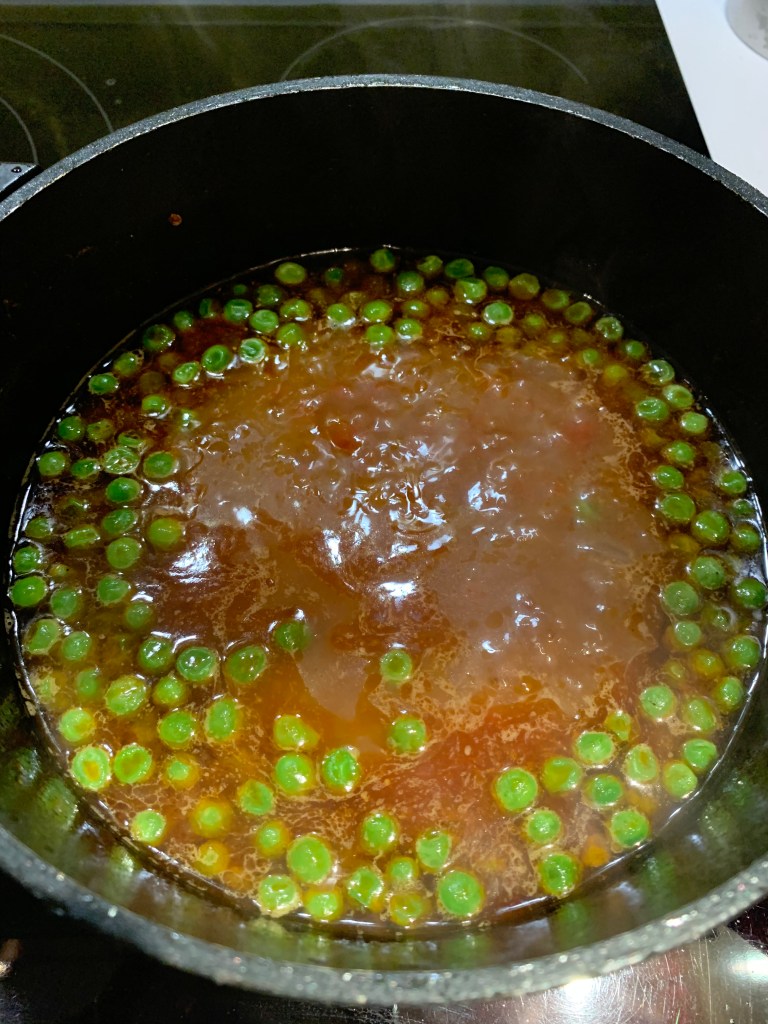 Il giorno dopo portare a ebollizione per 30 minuti, aggiungere i piselli quando mancano 10 minuti a fine cottura e impiattare.