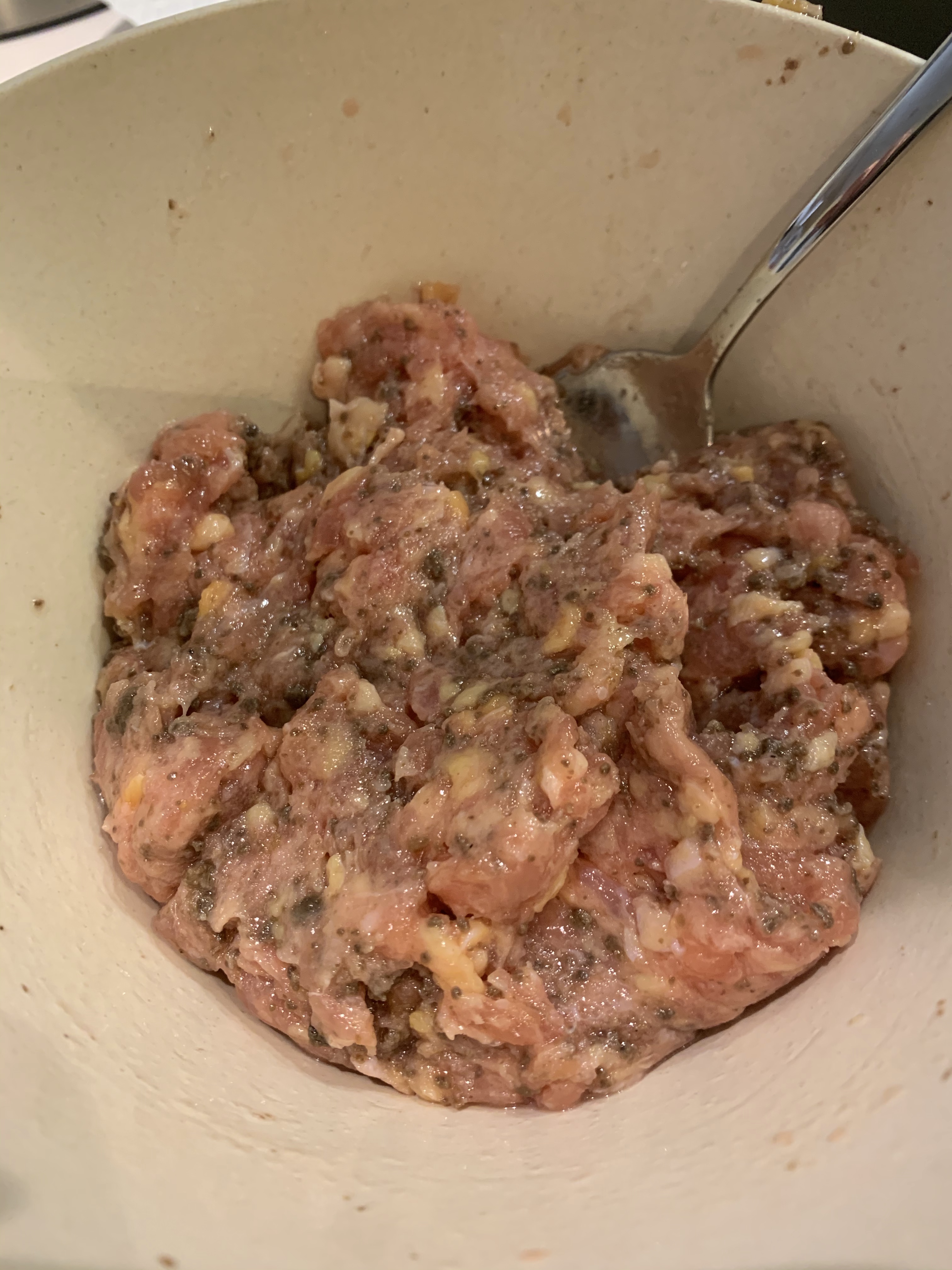 Una volta dorato, lasciatelo riposare per qualche minuto e nel frattempo preparate il ripieno di carne trita di pollo e tre cucchiaini abbondanti di pasta al tartufo.