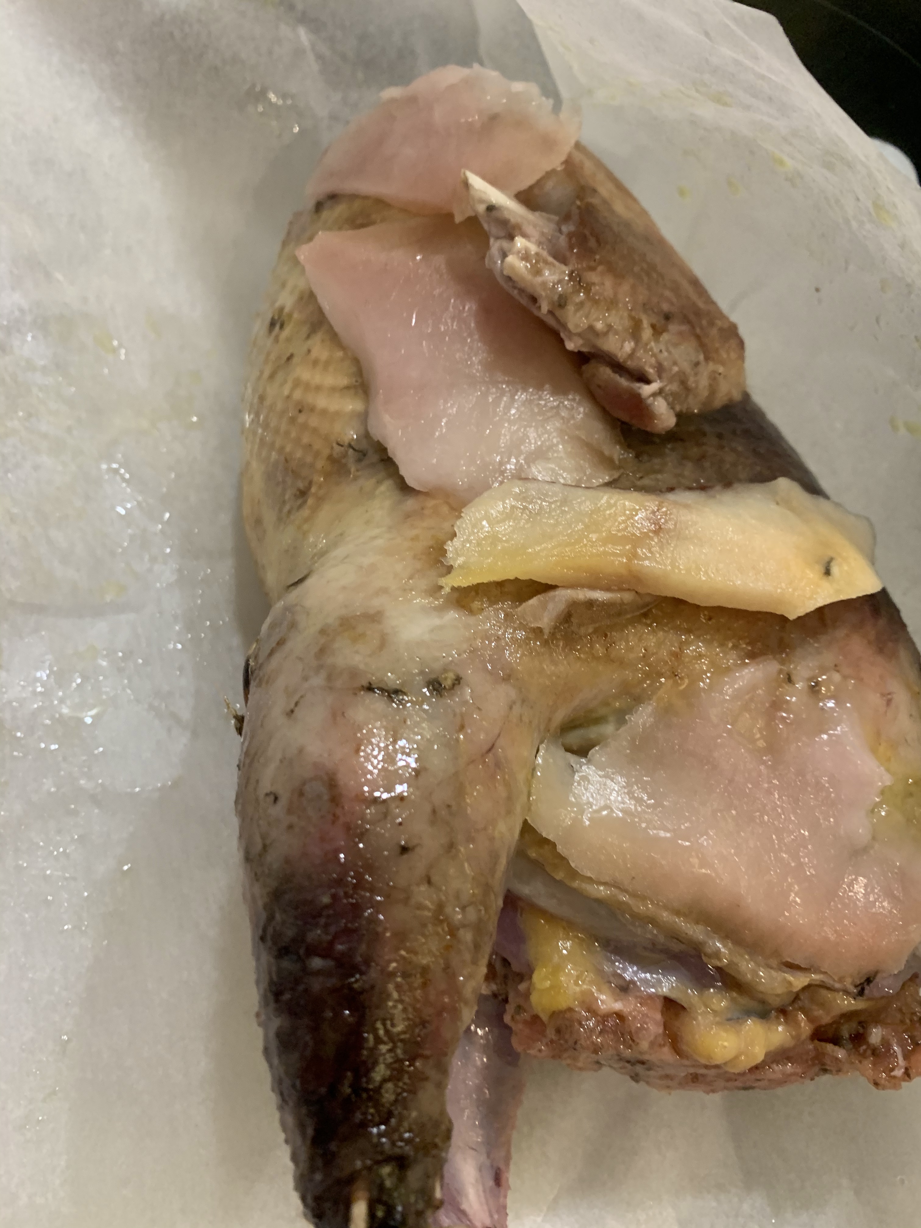 Una volta terminata la cottura aprire la carta e tagliare la carne per poterla impiattare. La salsa va preparata con un po’ di ripieno, olio d’oliva e la cipolla caramellata che si trova all’interno del cartoccio di carta da forno.
