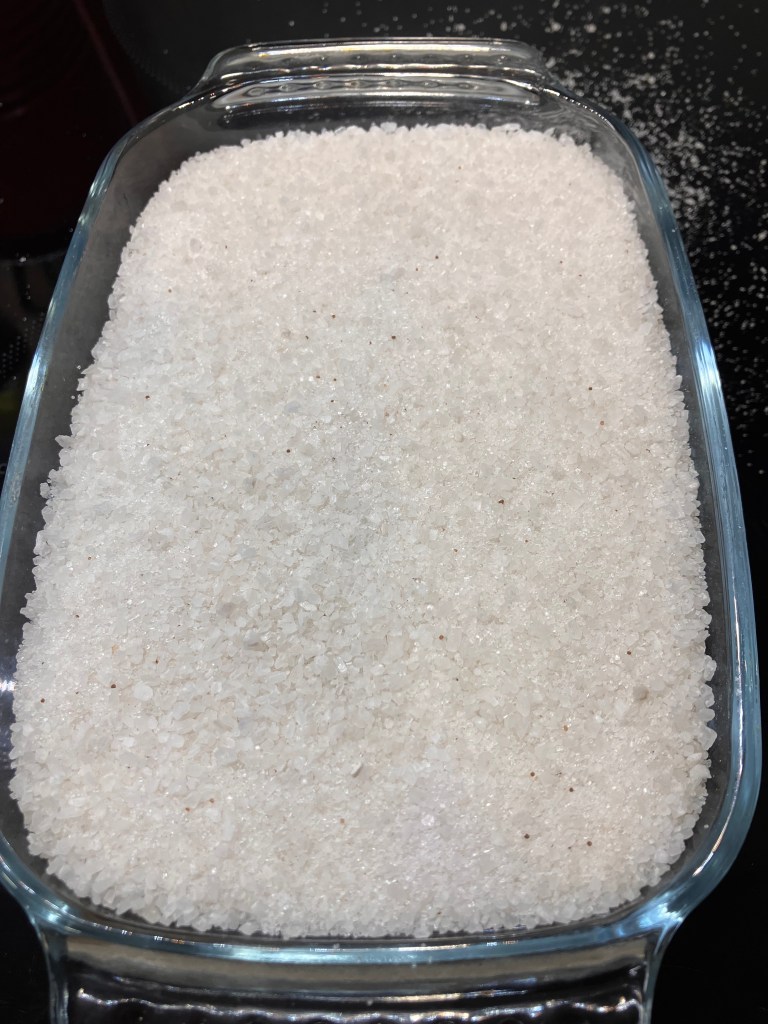 A seguire, preparare una pirex con un fondo di sale, disporre le sardine fino a completare uno strato e aggiungere del sale fino a coprirle completamente. Continuare ad aggiungere strati di sardine e sale. Una volta terminate le sardine, sigillare la pirex con una pellicola trasparente e mettere in frigorifero per almeno 24 ore.