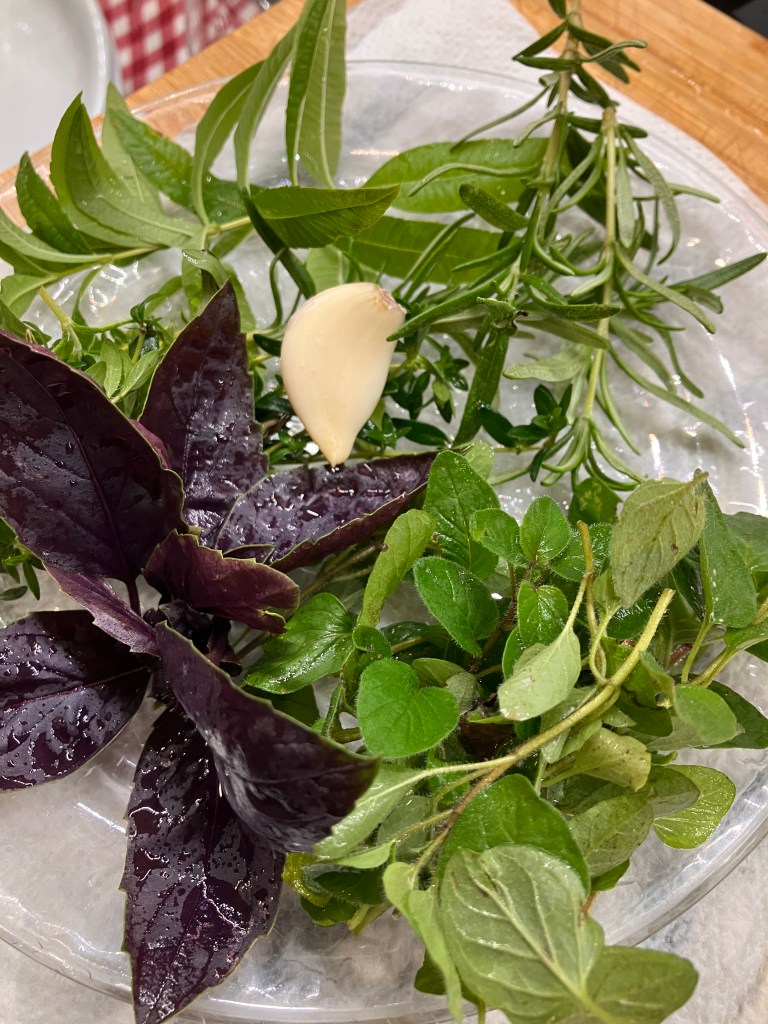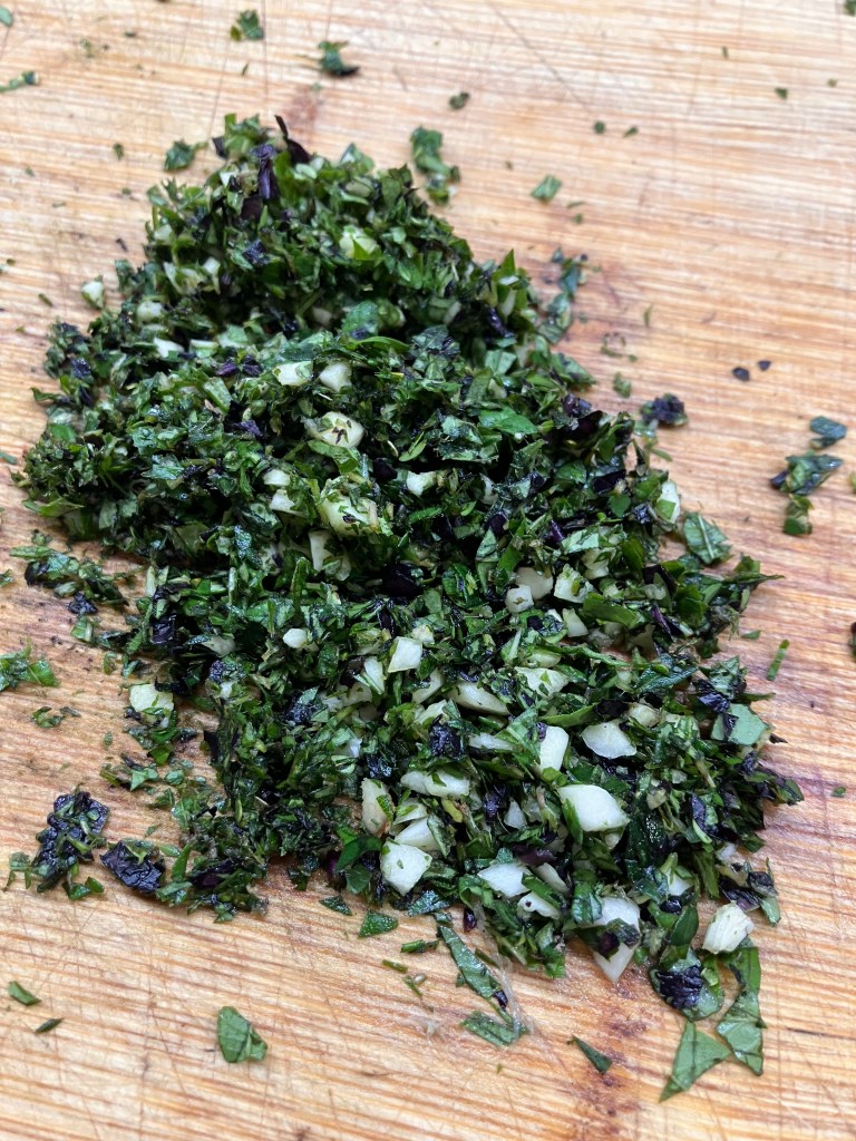 Nel frattempo preparare un trito di erbe aromatiche e aglio. Io ho usato basilico porpora, timo, timo limone, erba citronella e rosmarino.