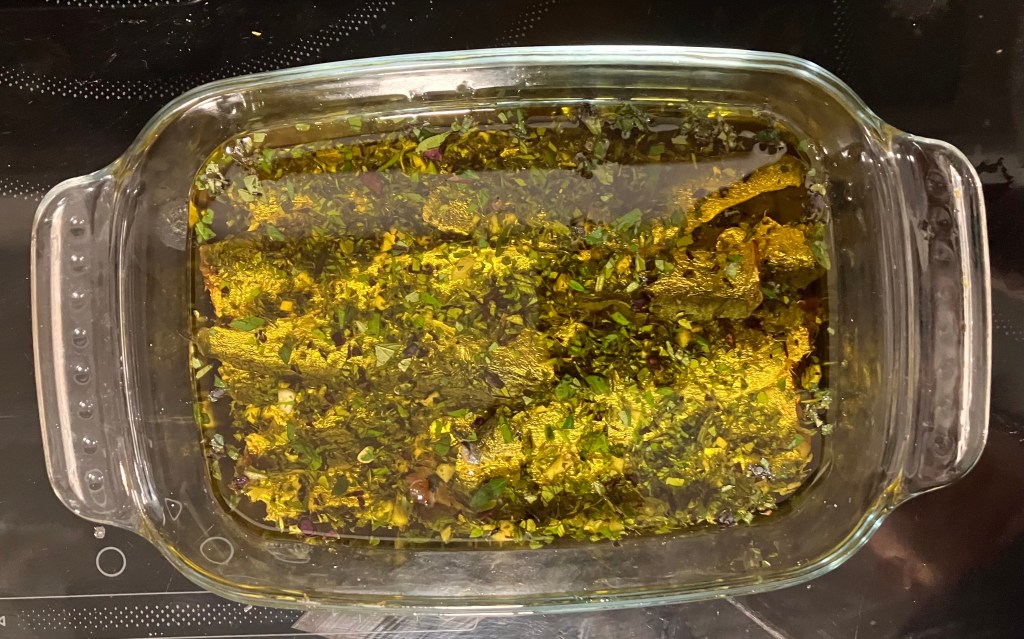 Usare la stessa pirex che abbiamo usato per salare le sardine ma questa volta con l’olio d’oliva estravergine e il trito di erbe aromatiche e aglio. Disporre de sardine con l’olio e le erbe.