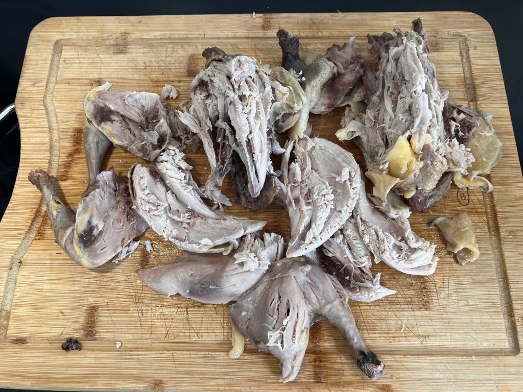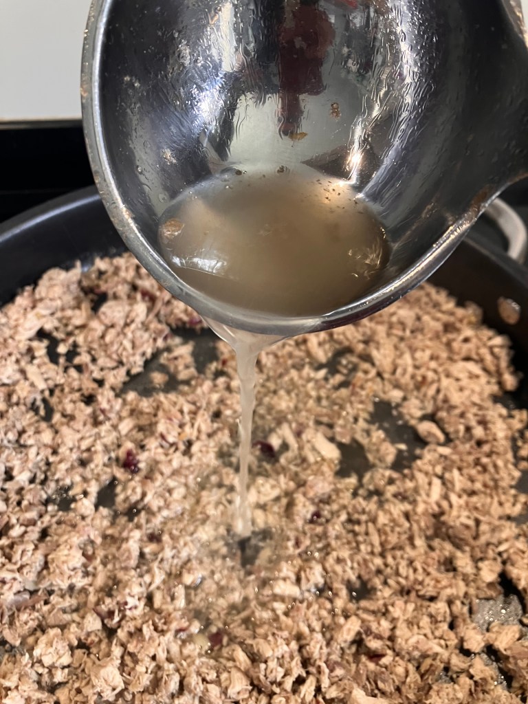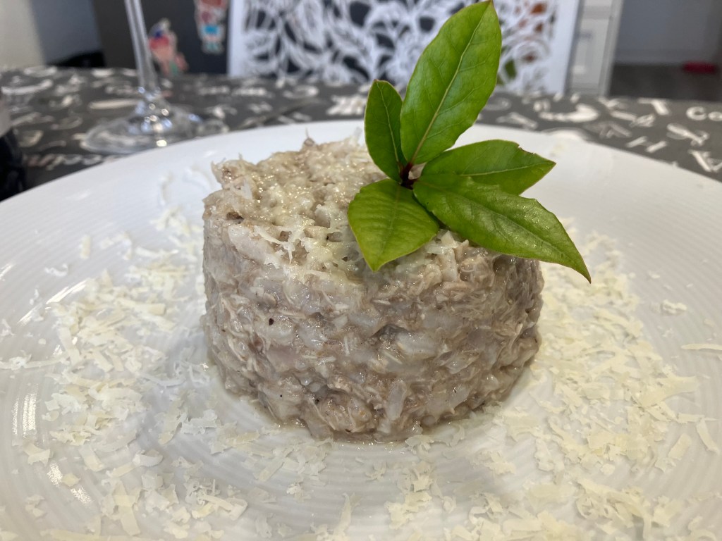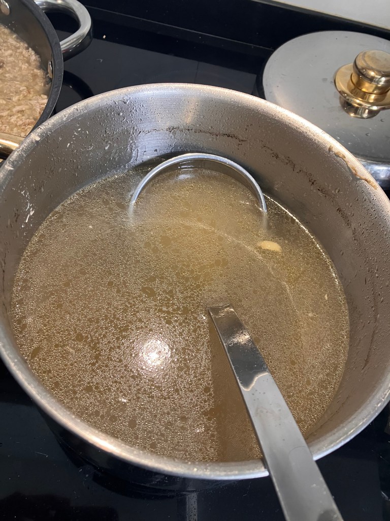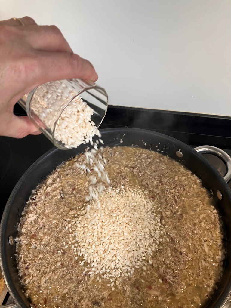 Dopo un’ora togliere le pernici e disossarle accuratamente. Mettere la carne nel brodo e far cuocere un’altra ora. Alla fine della cottura, con un colino, separare la carne dal brodo. Con un coltello affilato sminuzzare la carne fino ad ottenere un ragú. In generale non batto troppo finemente la carne perché con alcuni pezzi piú grandi il risotto risulta piú gustoso.