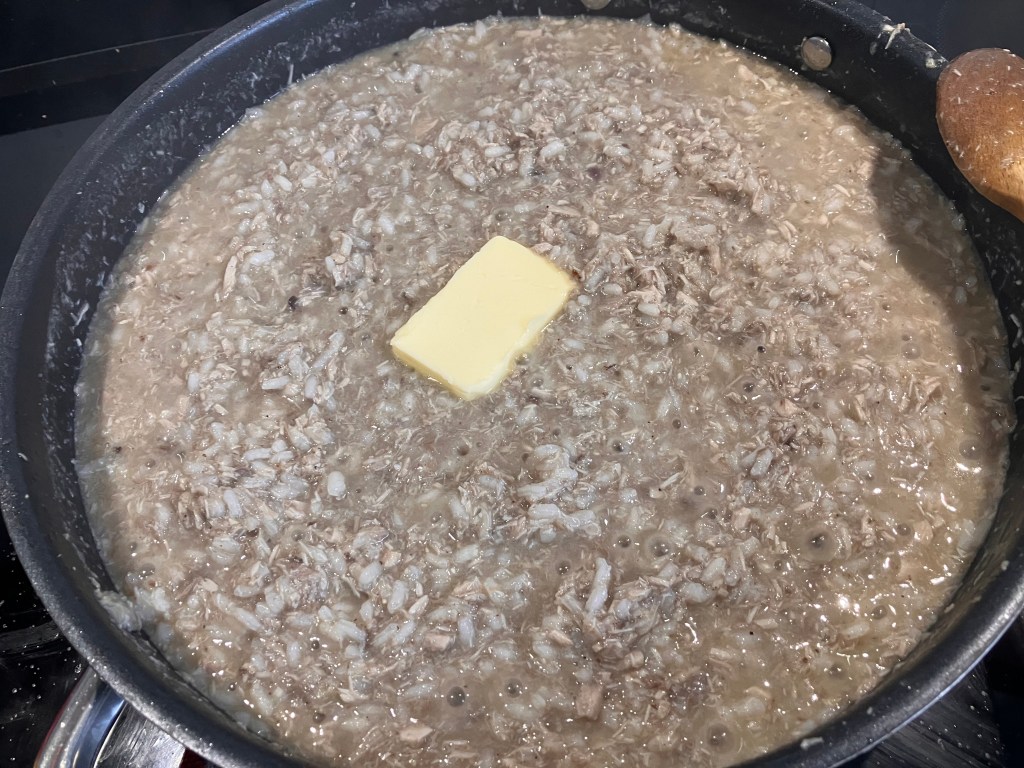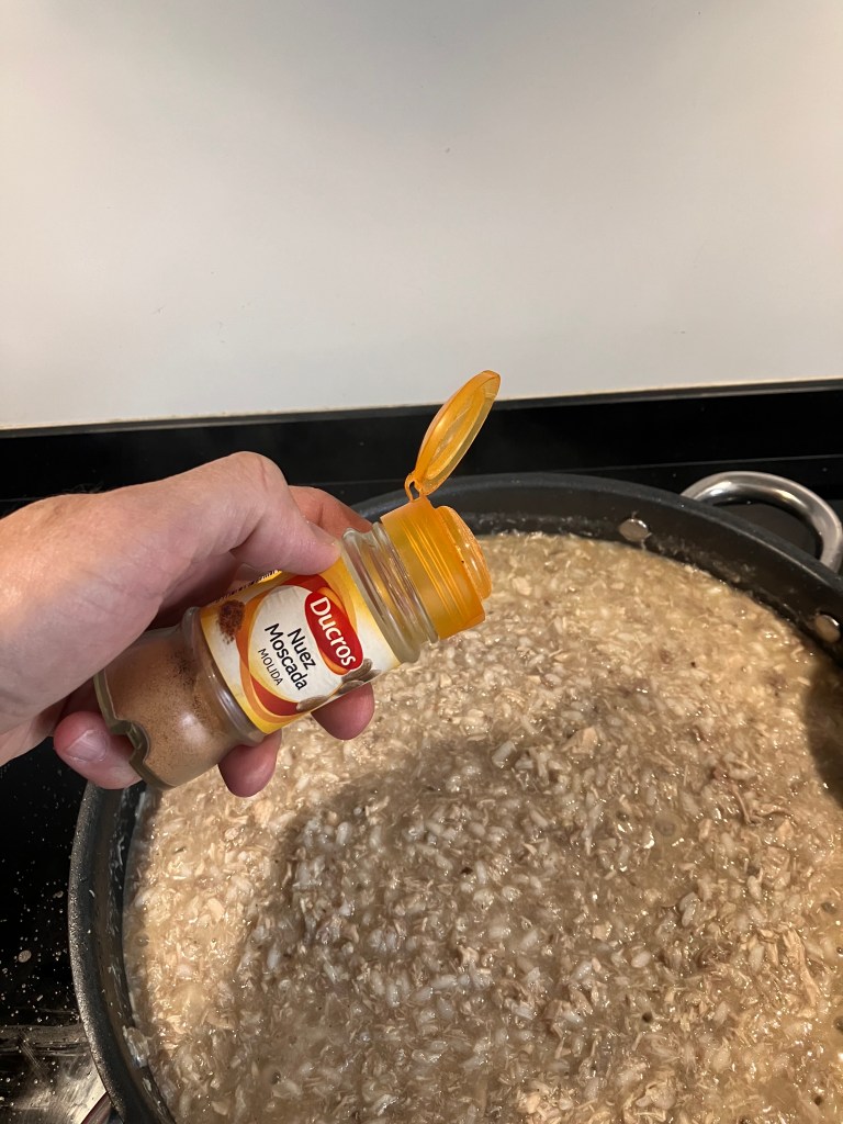 Quando mancano 5 minuti a fine cottura, aggiungere una lacrima di vino rosso, molto poco perché altrimenti rischiate di far colorare troppo il risotto e di perdere il sapore originale delle pernici. Stesso discorso con la noce moscata. un pizzico solo. Non dimenticate l’ultima noce di burro.