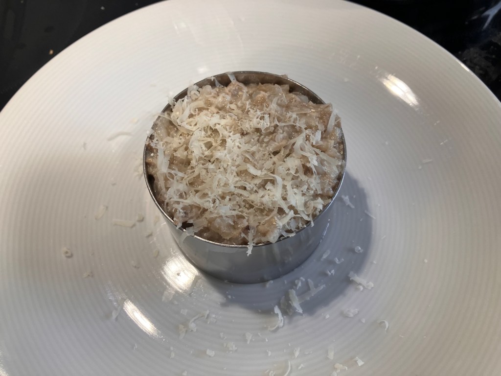 Per poterlo impiattare, assicuratevi che il riso non risulti troppo “all’onda”, ovvero con troppo brodo. Se vedete che e´troppo acquoso, rimestare a fuoco alto pochi secondi fino ad eliminare quasi completamente il licquido in eccesso.